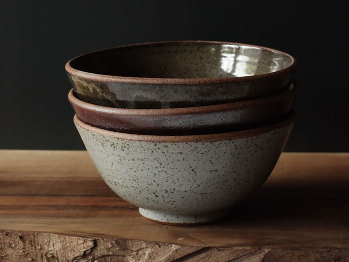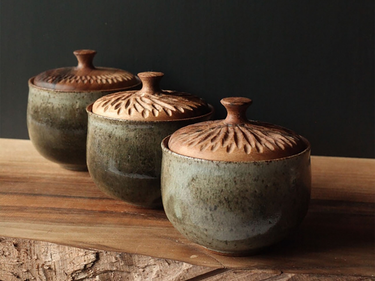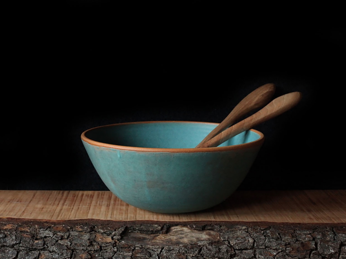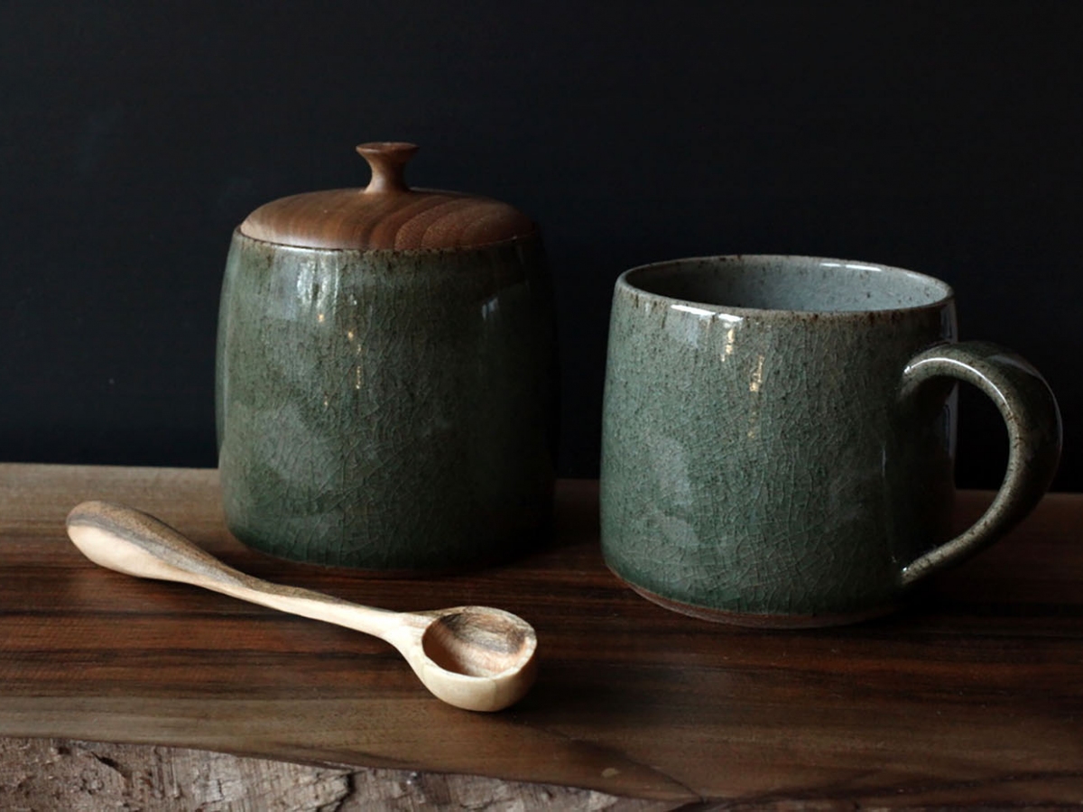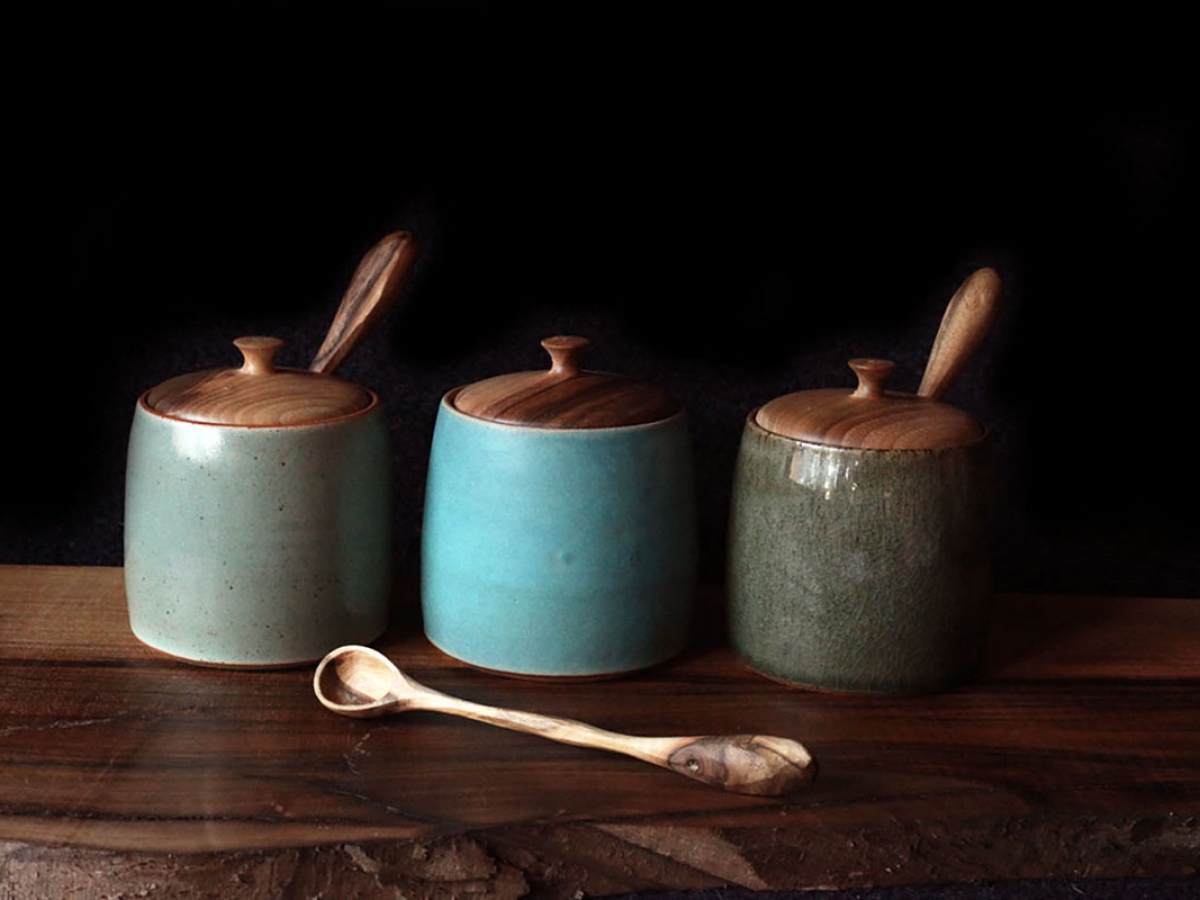 The stoneware pottery is hand-thrown and complimented by hand-carved wooden spoons, wooden boards, and turned wooden lids. Glaze development is a big part of the process with the creation of a palette of colours that compliment each other and the simple forms of the tableware. The pieces are all food safe and are a mixture of gas fired tenmoku and celadon glazes and more colourful glazes that are fired in an electric kiln.