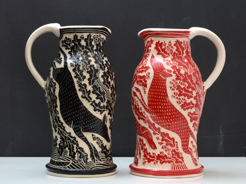 Simon Olley makes ceramics in beautiful glazes, often illustrated with dogs – both real (to commission) and imagined. I love these black and red Dog Jugs that have such energy and wit. The series based on Simon’s own Labrador Retriever is equally engaging.