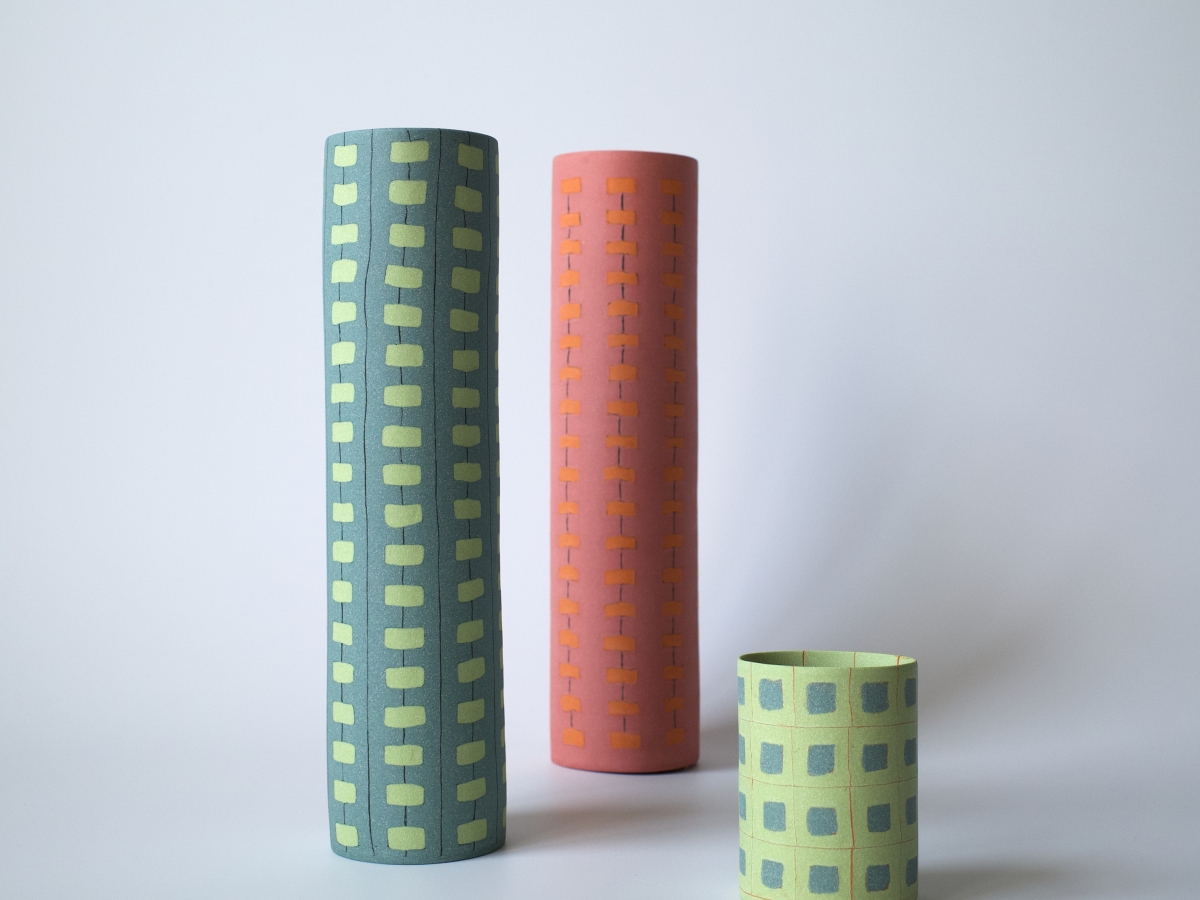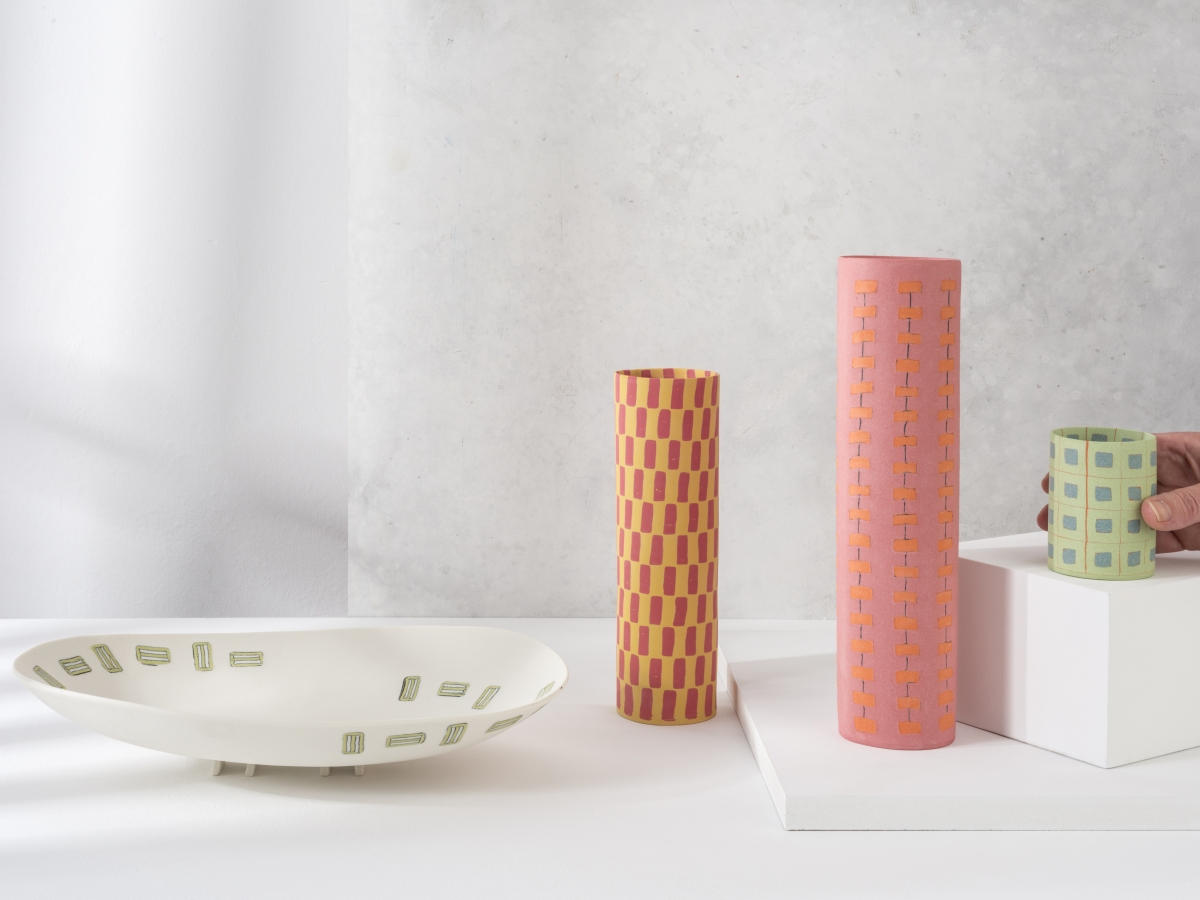 I am a ceramic artist specialising in patterned porcelain handbuilt pieces. My practice focuses on creating functional ceramic forms using a unique technique of laminating coloured strips of porcelain, in a similar method to the pattern making of wooden parquetry. Often inspired by the urban environment and textiles, each of my one-off pieces is a result of a technically challenging confluence of visual aesthetics and vessel structure.