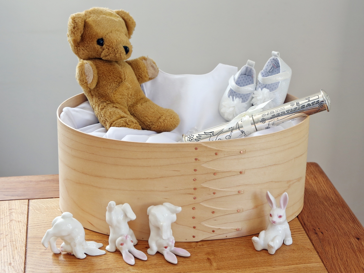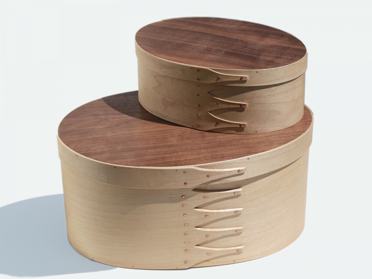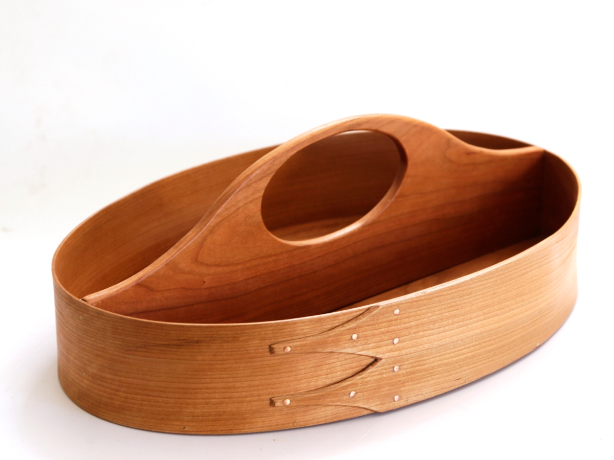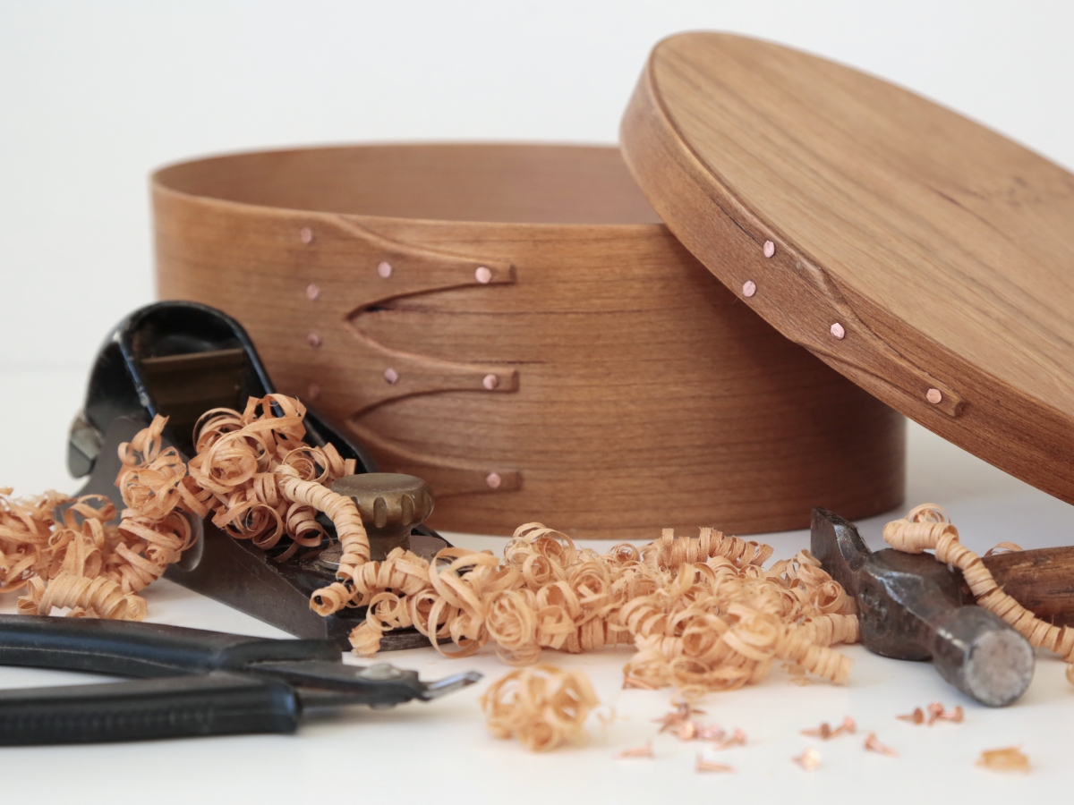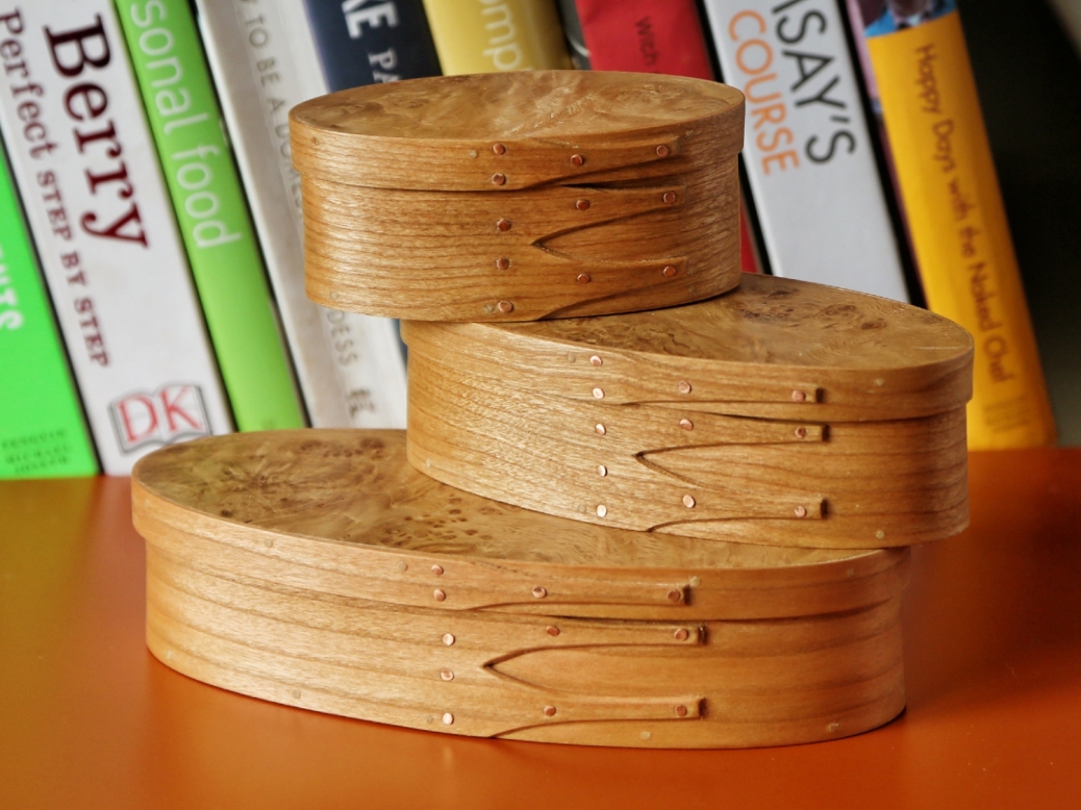 Andrew makes ‘Shaker style’ wooden boxes and other items, drawing on the traditions of simple elegant design combined with usefulness of purpose. His boxes are crafted primarily from thin strips or veneers of cherry and maple woods in laminated and solid wood forms and fastened with copper tacks and rivets. Bending the wood to form the oval shape, which is characteristic of his boxes, involves ‘steaming’ in a water bath to make the material pliable. Joints are made in the traditional swallowtail shape which adds strength. Lids and bottoms are held in place with small wooden pegs and not glued in place.