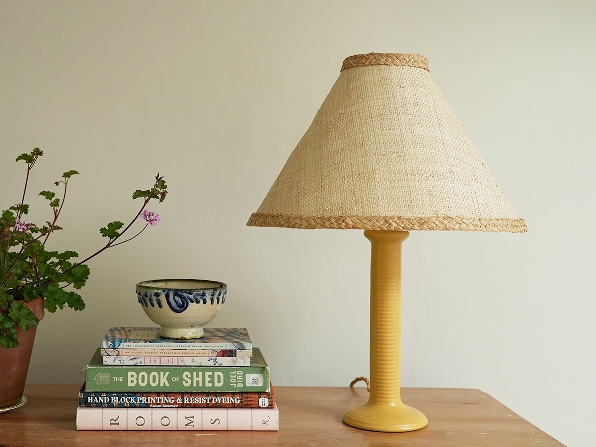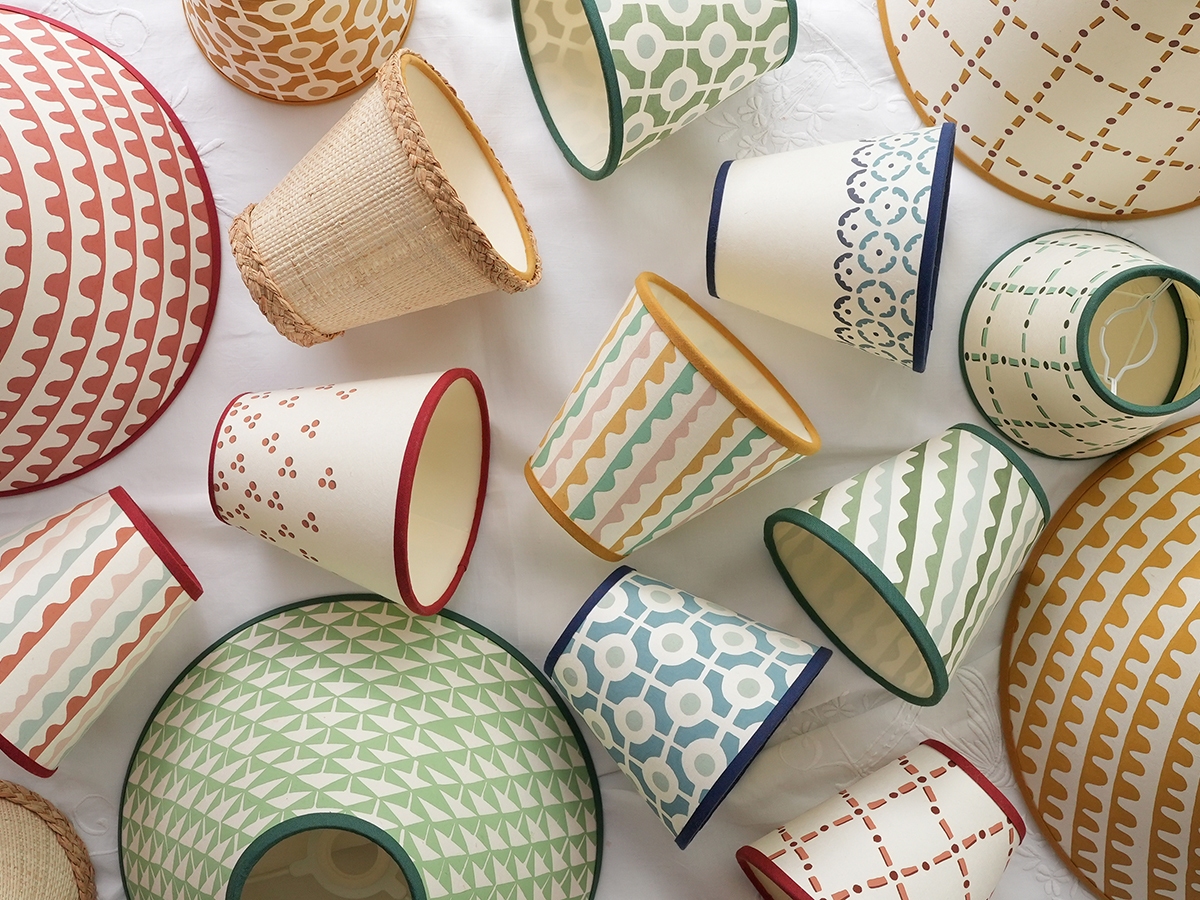 Textile designer and printer Anna Vojtisek uses a blend of hand painting and traditional block printing to produce handcrafted paper lampshades. She also makes a range of woven raffia lampshades which are bound in coloured cotton trim or edged in braided raffia.