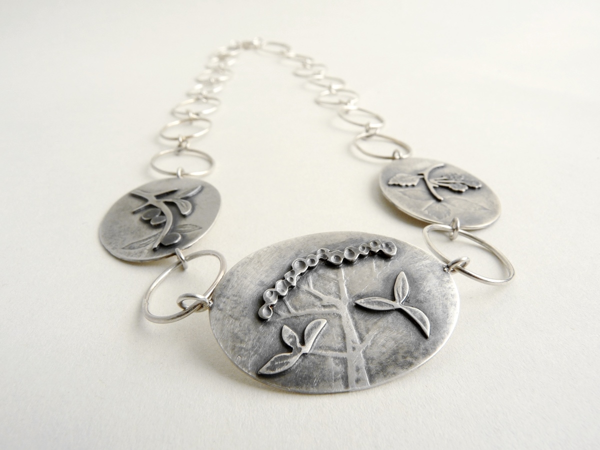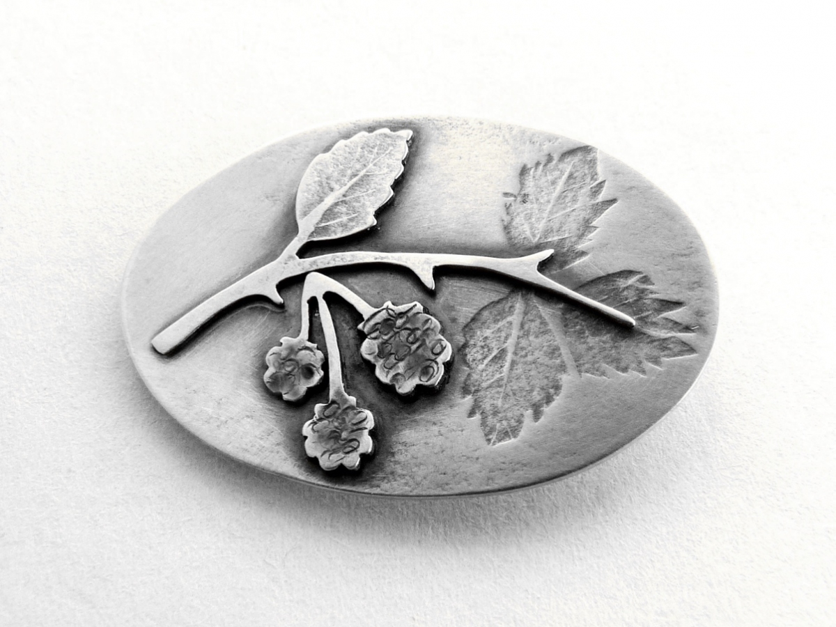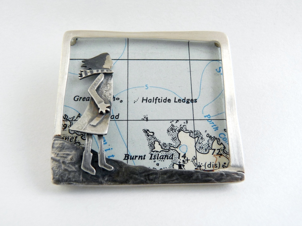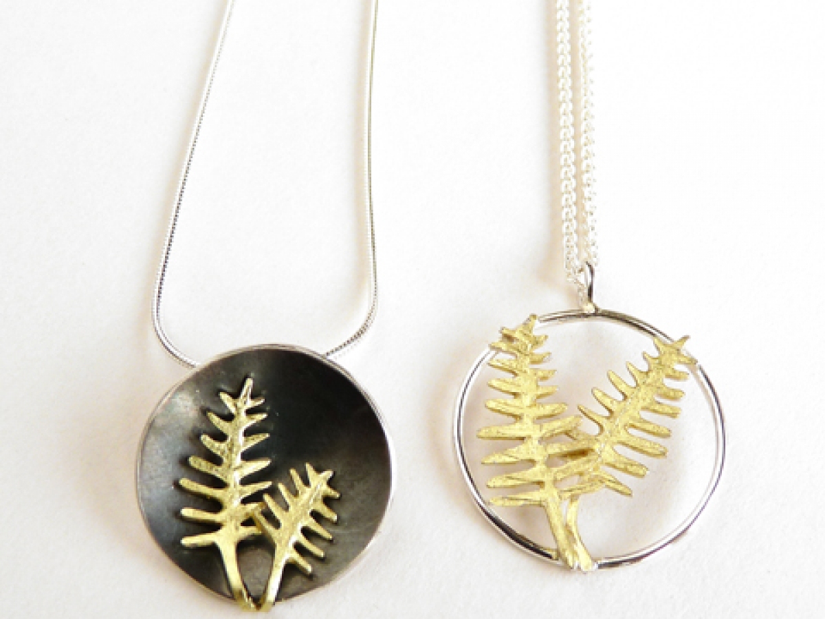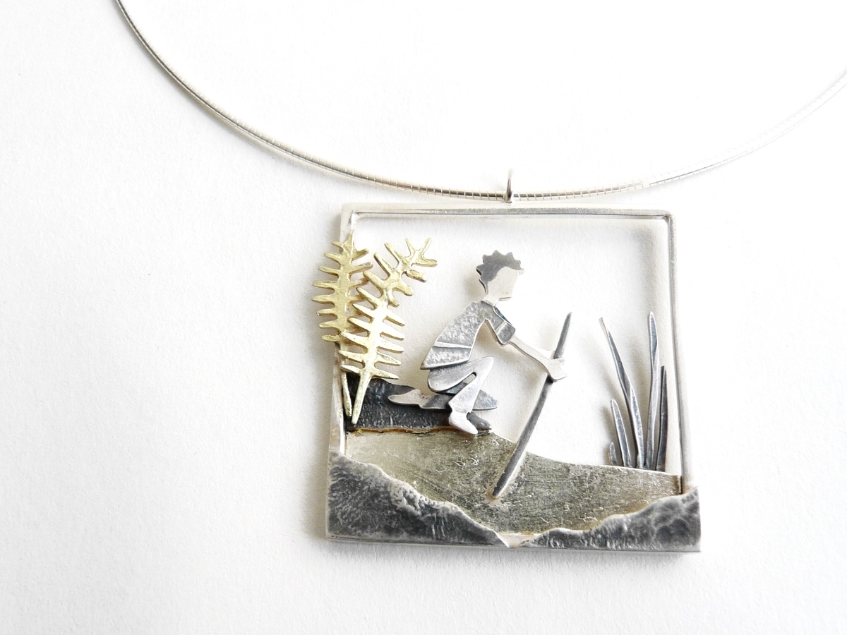 Largely inspired by the great outdoors and the wonder of being in it, elements of narrative are transformed from pencil sketches into silver scenes telling out across the surface of a brooch or hanging as a pendant. They are individually hand cut in sterling silver, and textured by embossing with paper cuts, stamping and hammering. Components are layered together, soldered and finished with matt, oxidised and polished surfaces, to add depth and tone. Finally the addition of gold leaf in certain ranges brings colour and highlights details.