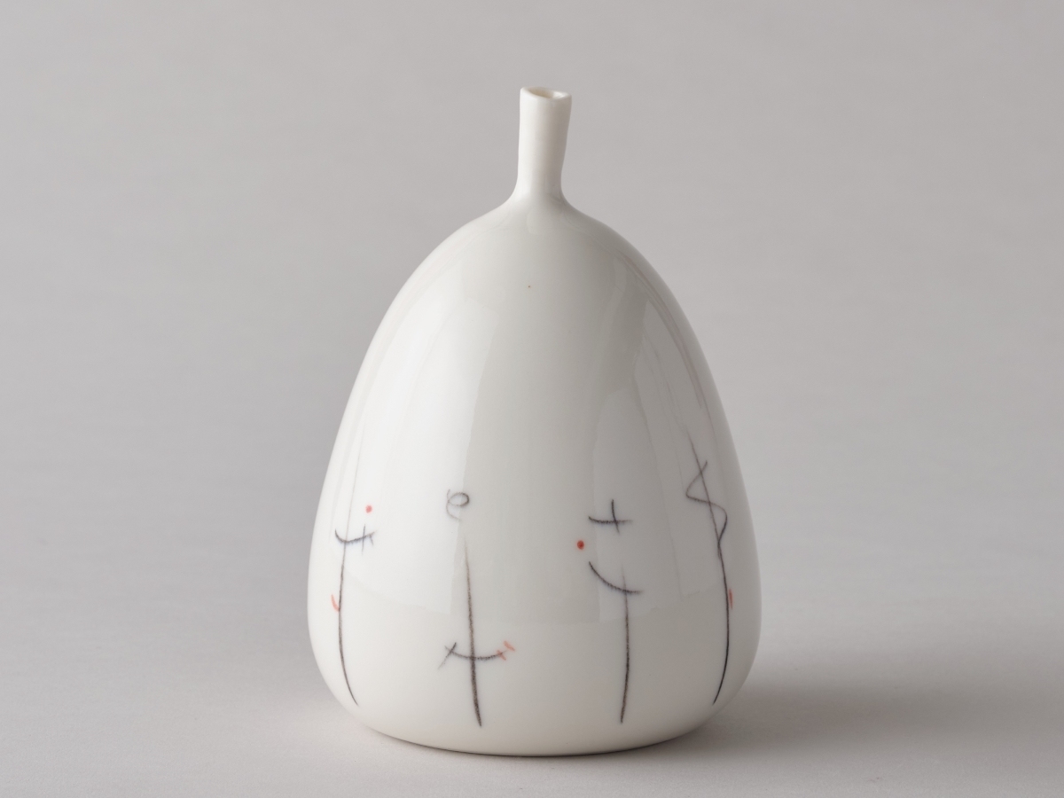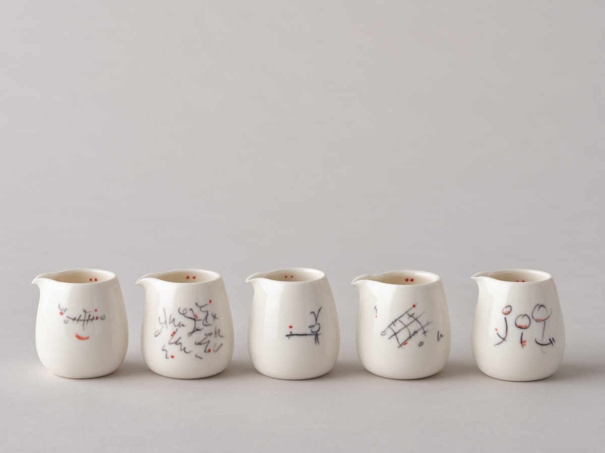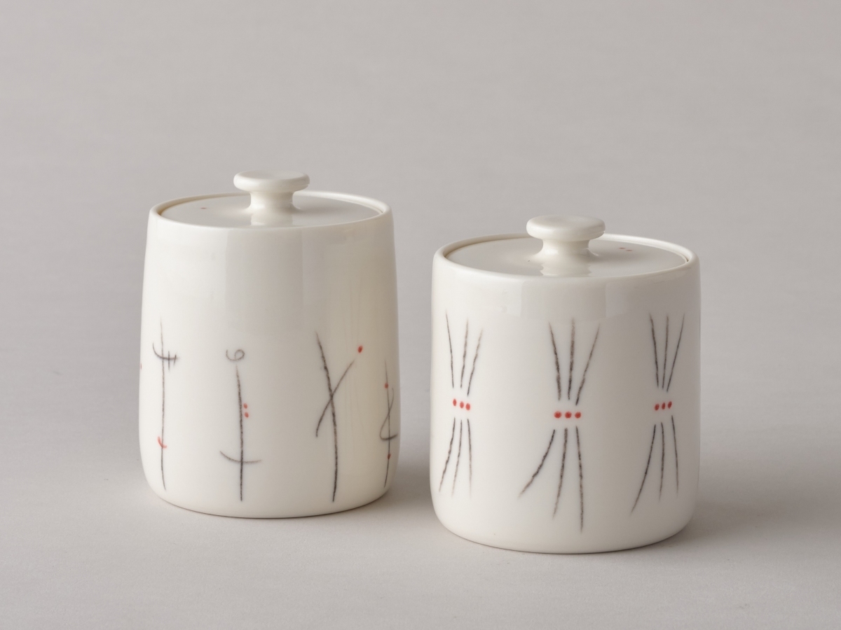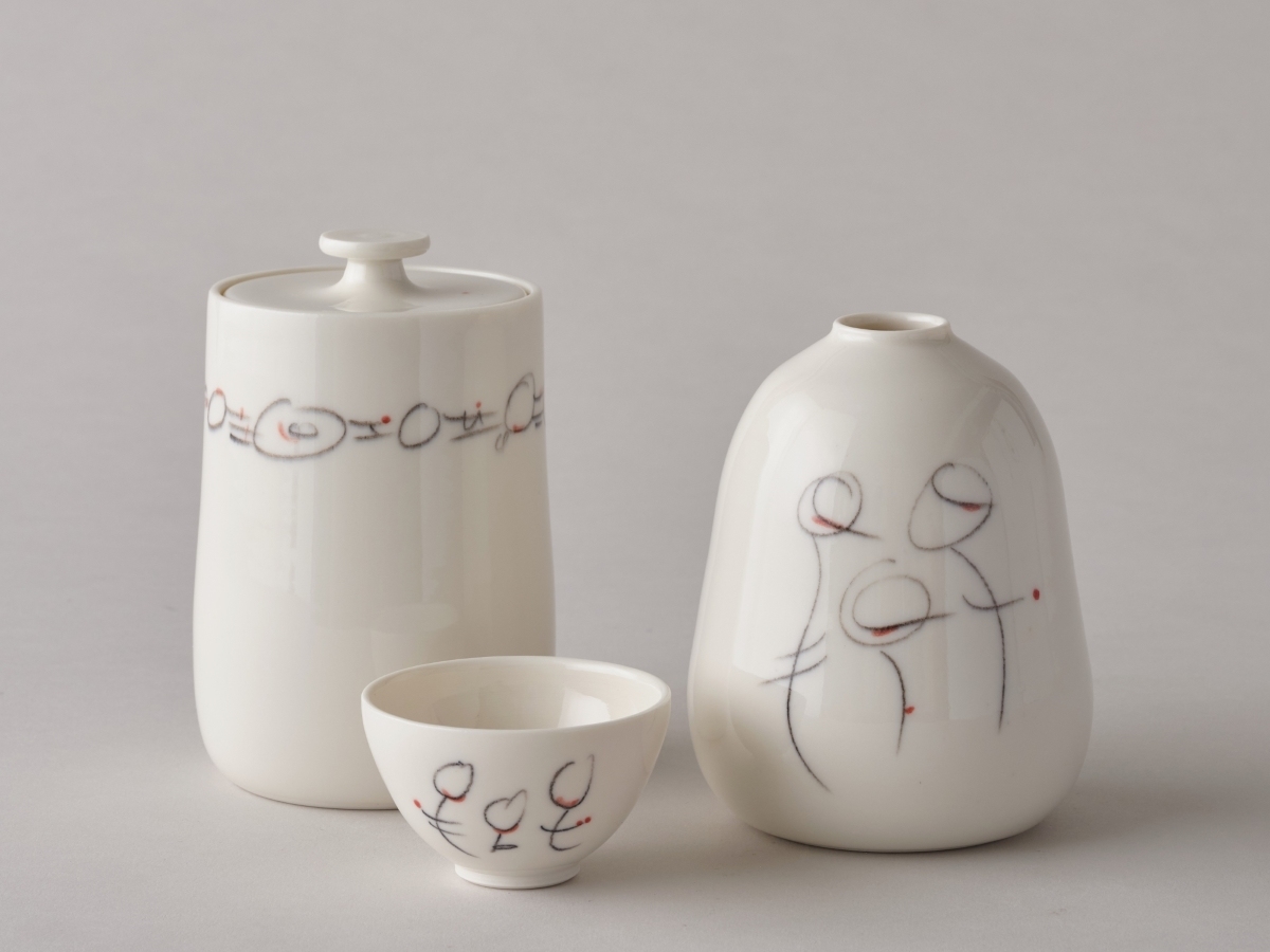Most of my pieces are decorated with ceramic pencil and underglaze colours and all work is then glazed with a glossy transparent glaze and high-fired in an electric kiln. My work explores the balance between precision of form and fluidity in surface decoration. I aim to create pieces that are pleasing to hold and invite speculation about the stories behind the designs.