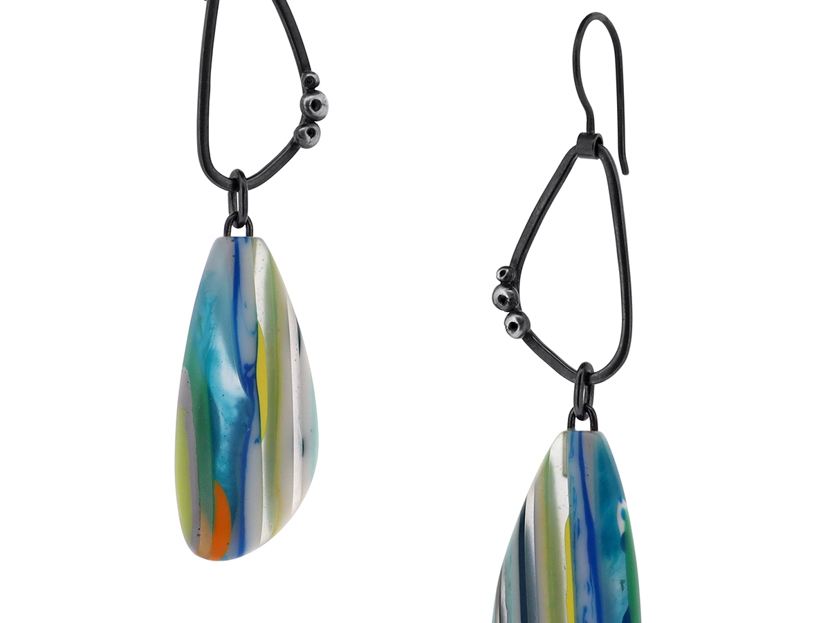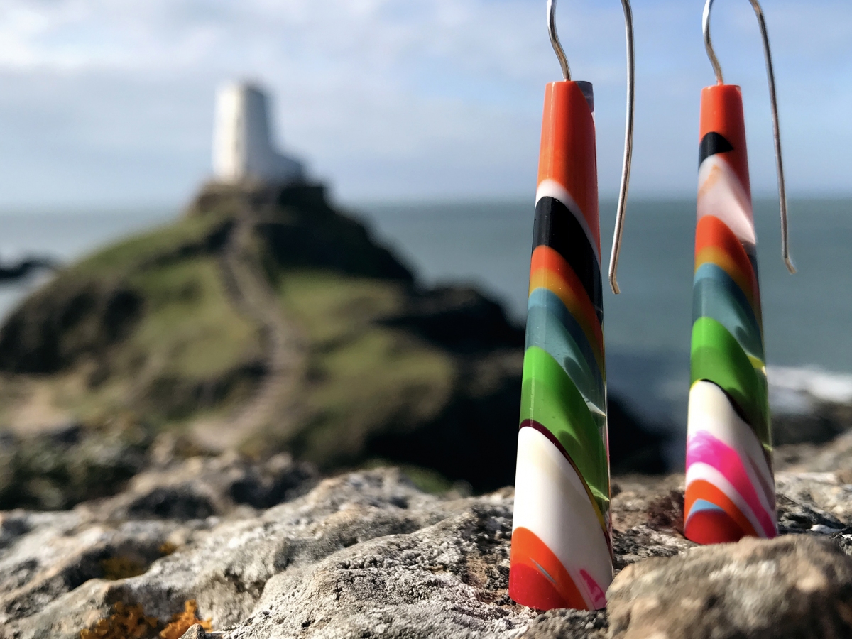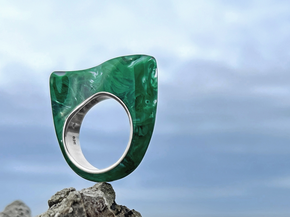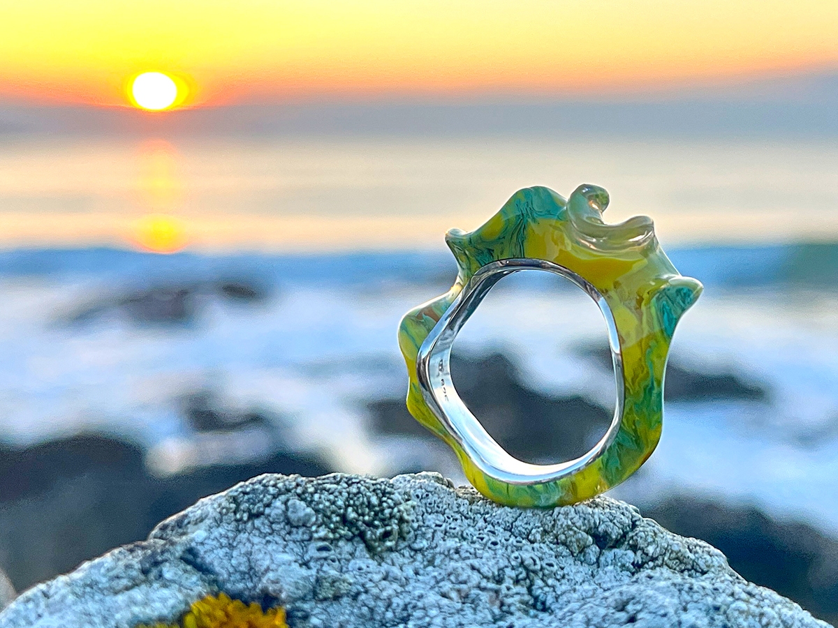 The Jewellery collection includes a selection of bright and bold earrings, necklaces and rings. Each piece of jewellery is entirely unique due to the nature of Surfite with pieces suitable for any gender. Precious metal elements are added to provide structure and form. Recycled metals are used wherever possible.