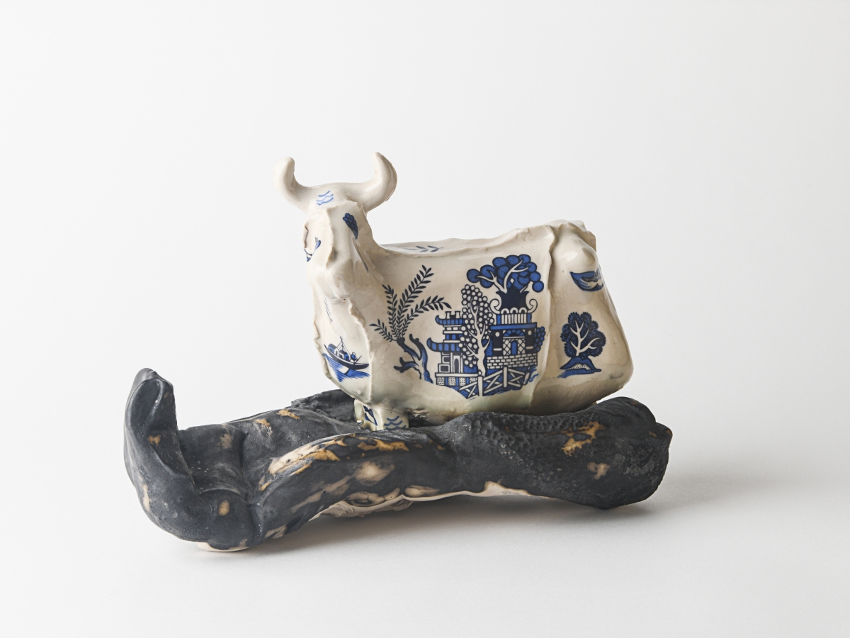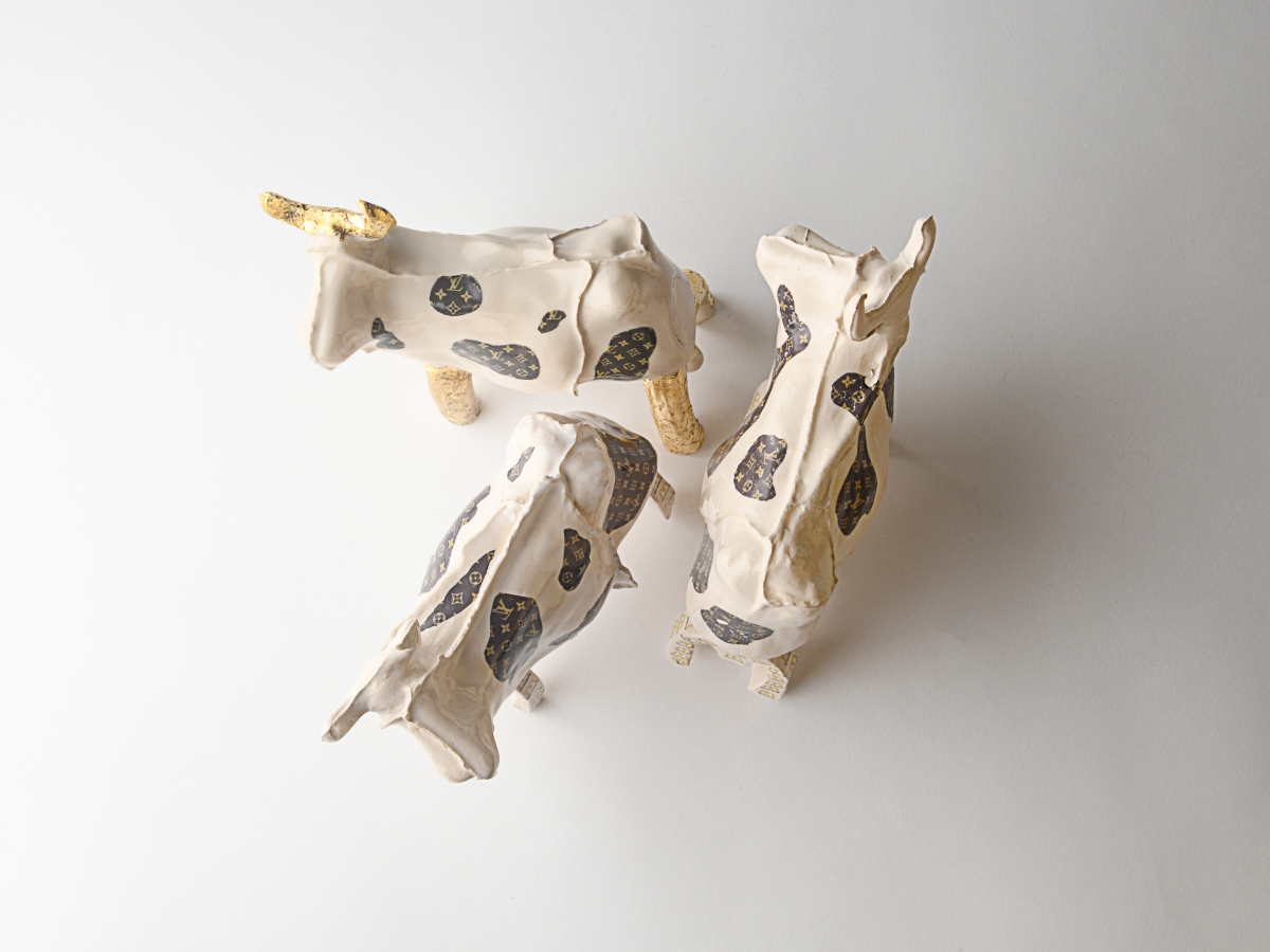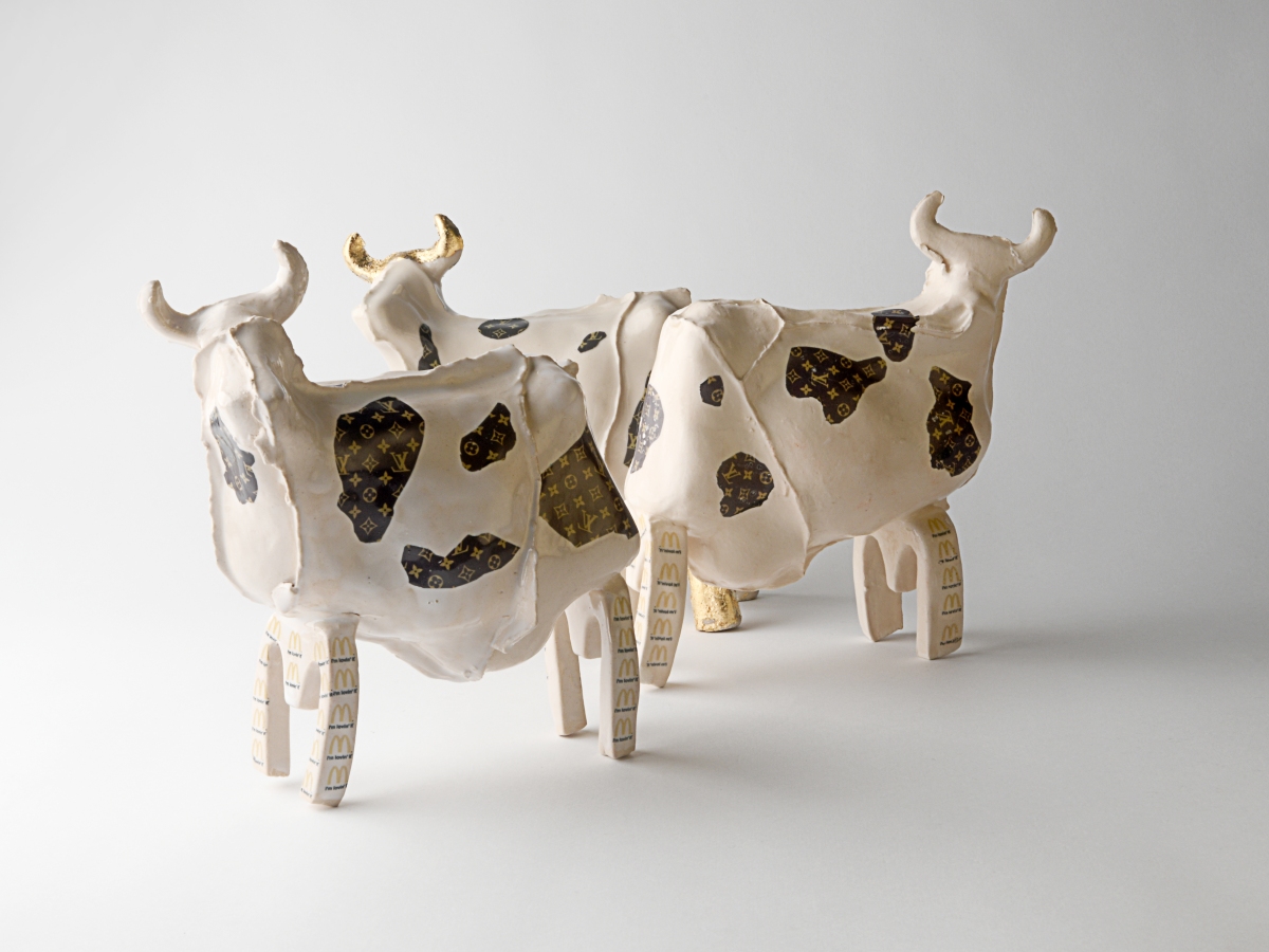 The fashion and fast food branded cows, with their M-logo legs, were inspired by a visit to family in Jamaica where, in Montego Bay, the first MacDonald’s had opened. In a neighbouring field stood a solitary cow,, a juxtaposition which carried a certain comedic undertone. The process of making this collection informed Claudette’s conceptual development, leading her to think about our consumption of the cow and its environmental impact.