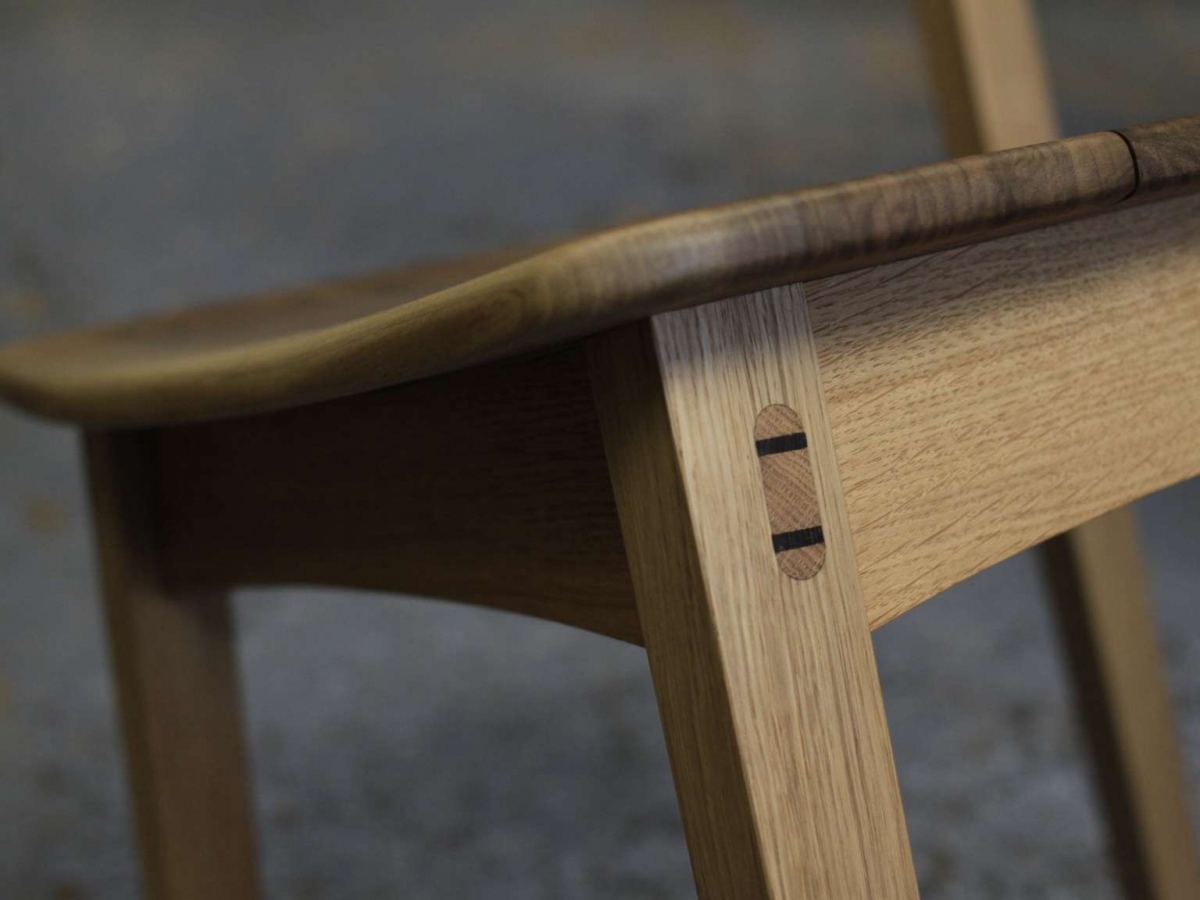 He has been concentrating on chair making recently and has developed a very comfortable dining chair with steam bent back and seat that can be made in a variety of contrasting wood such as Oak and Walnut or Ash and Lacewood.