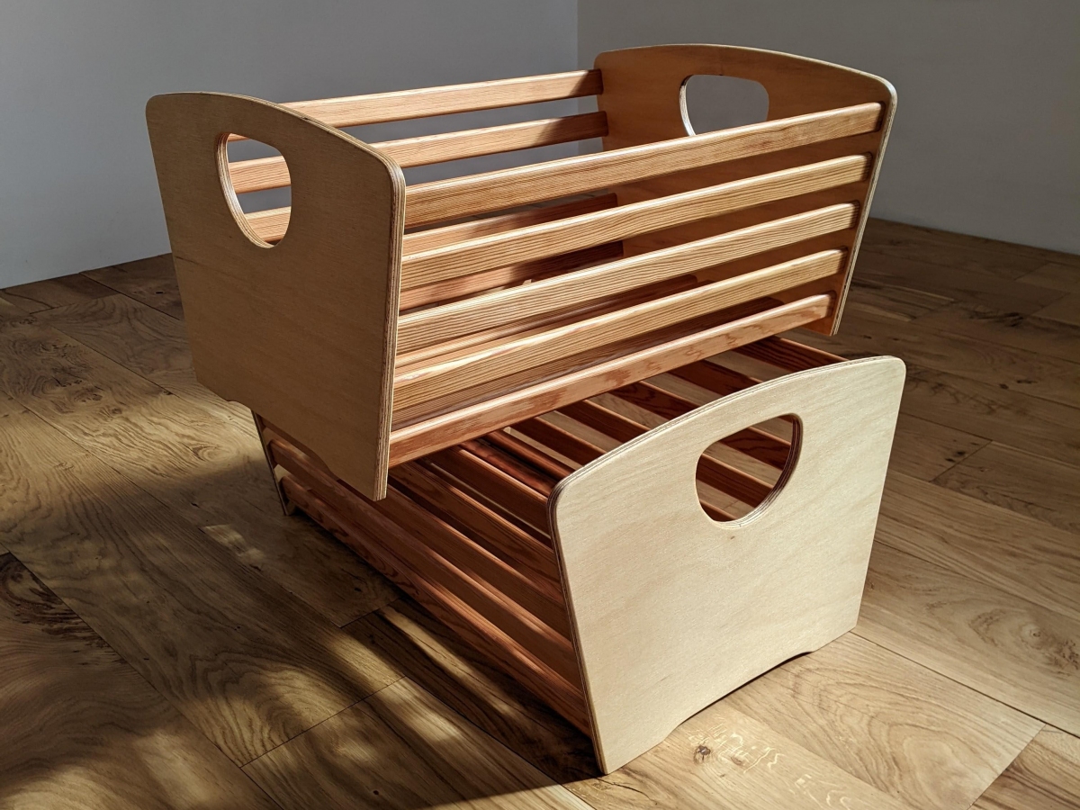 Another recent design that has been popular is the washing basket made from birch ply and pitch pine reclaimed from the old school where he lives.