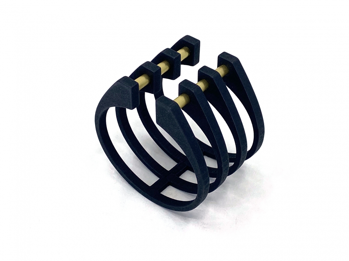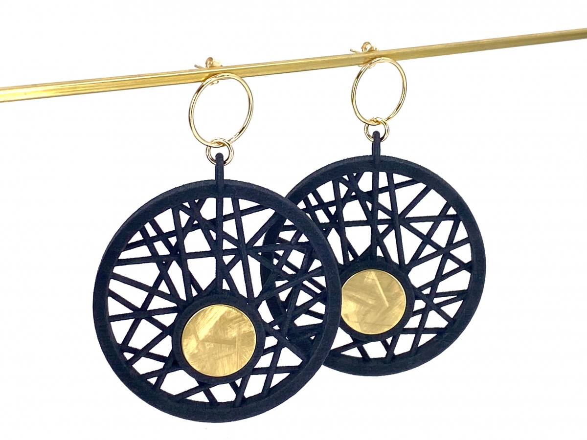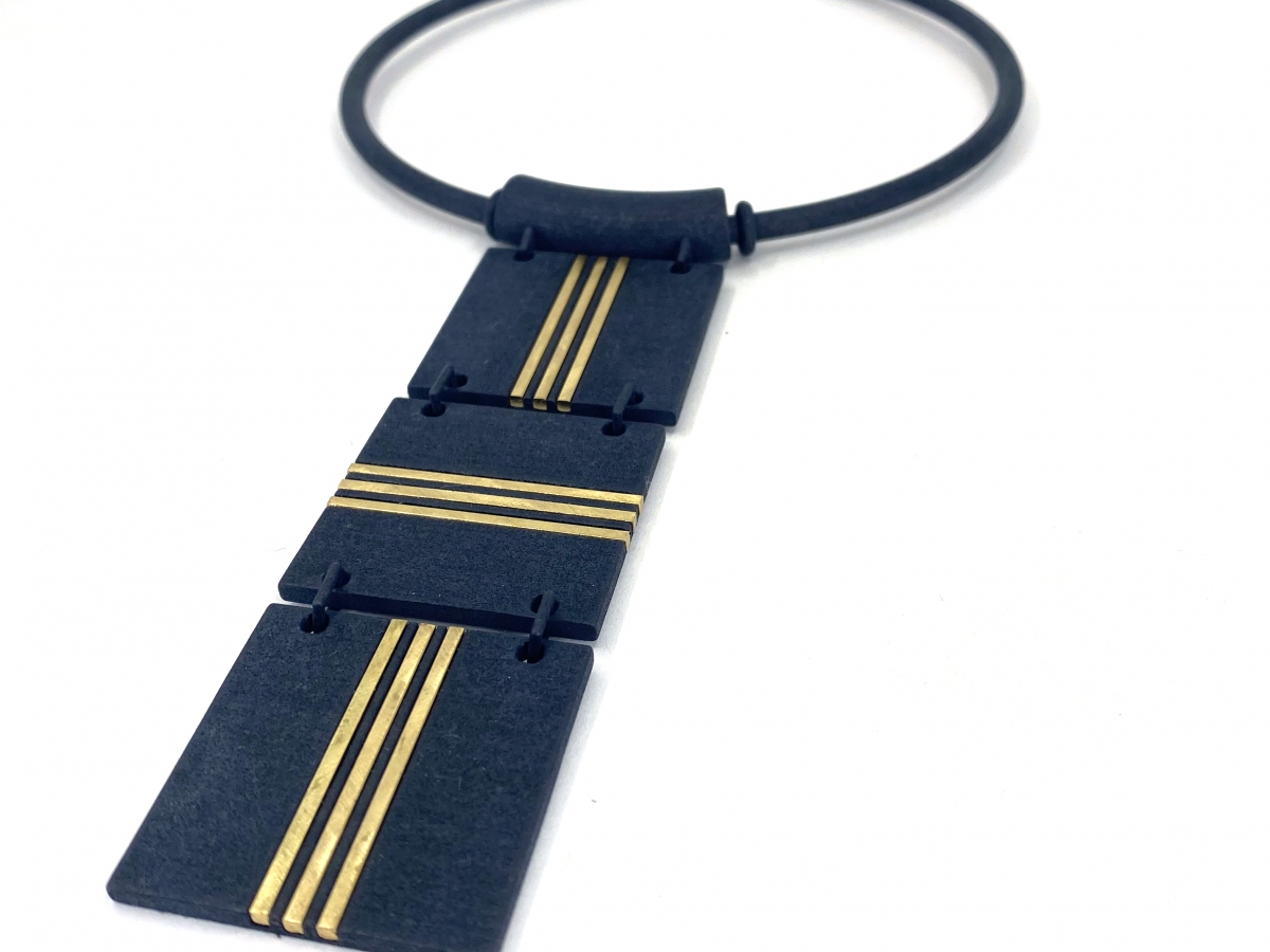 My design style is modern, simple and often with a bit of an edge. All inspired by modern architectural & sculptural forms, some of my pieces are handcrafted with brass and silver, sometimes combining the two. My latest collection has been created using CAD software and the 3D printing process, using a lightweight and highly durable material called Selective Laser Sintered Nylon, which is polished then dyed for colour application. Some of these stylish designs are adorned with handmade/finished textured brass or gold filled metal elements or silver components, combining the cutting-edge technology and traditional metalwork & jewellery making craft skills.