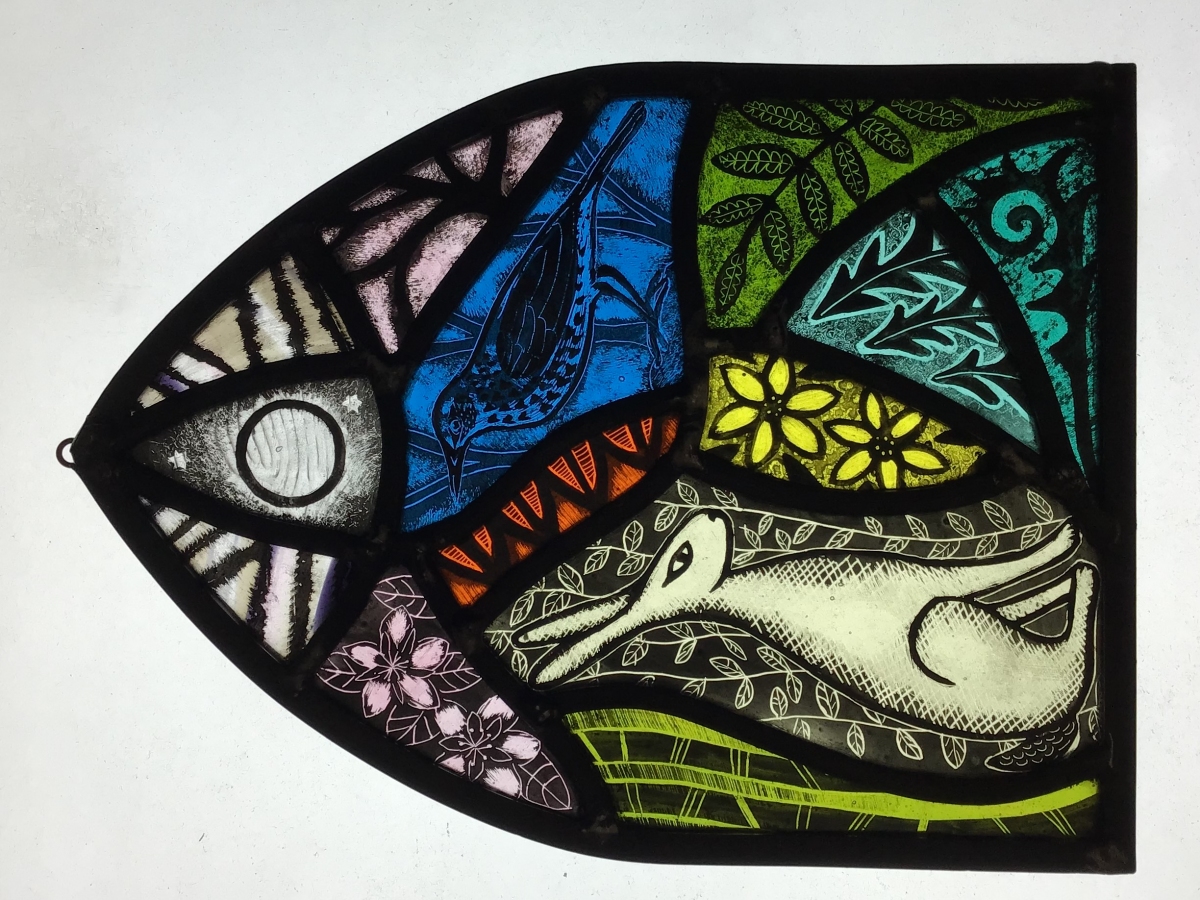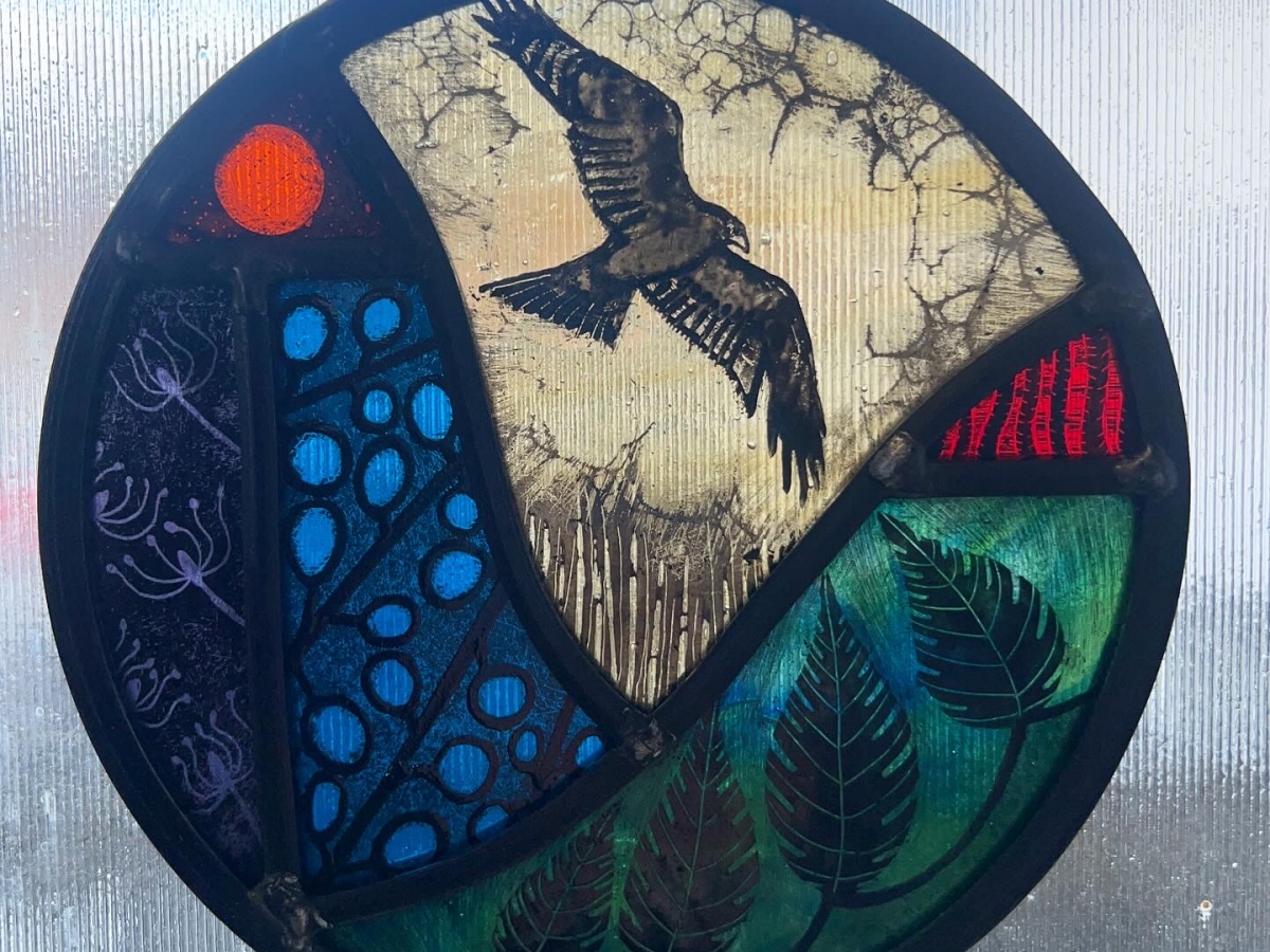 Designed, hand painted and fired leaded stained glass, inspired by the symbolisms reflected in nature. All pieces are unique and commissions are developed by working closely with clients and what is meaningful to them. This has especially been apparent in the memorial panels made for a local Long Barrow. Also working to commissions of windows in the home alongside designs sold on the website.