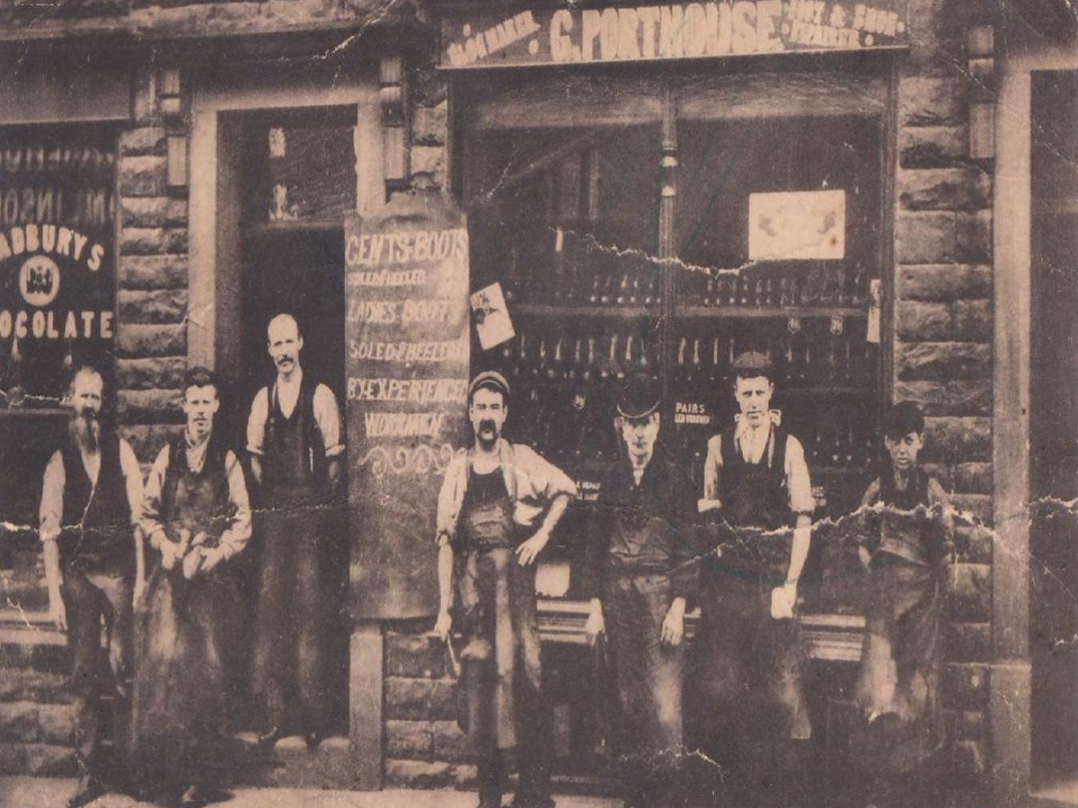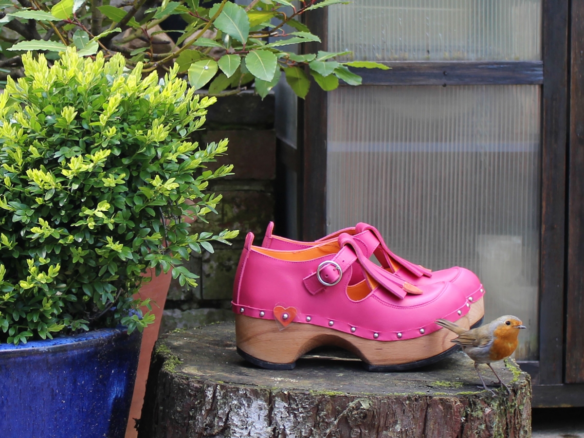 Jackie creates modern, vibrant, stylish clogs, paying homage to her Great Grandfather who produced traditional clogs in Cumbria (see the old photo of his clog shop). Inspired by colour, nature and playful exaggerated details and shapes, the clogs are handmade using full grain leather and beech wood in her garden workshop in Leicester.