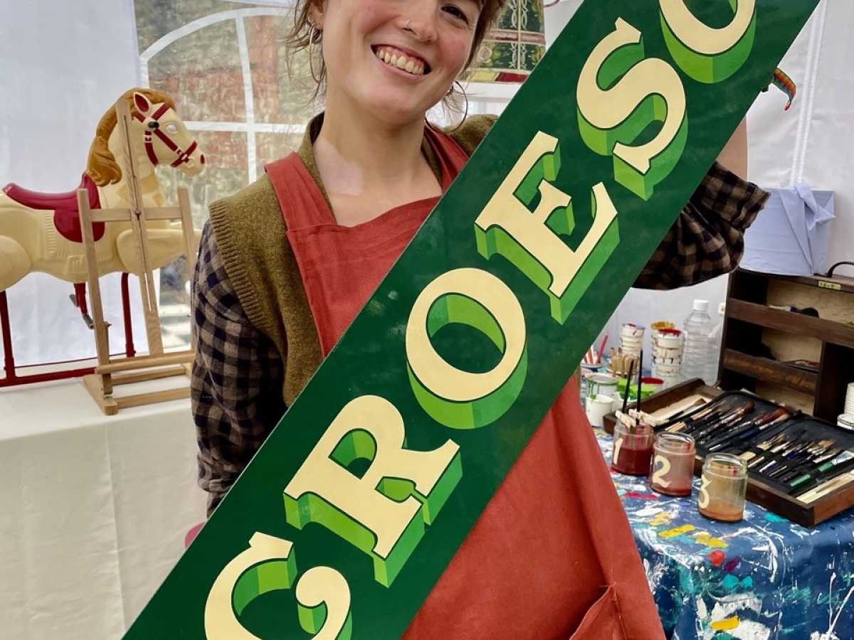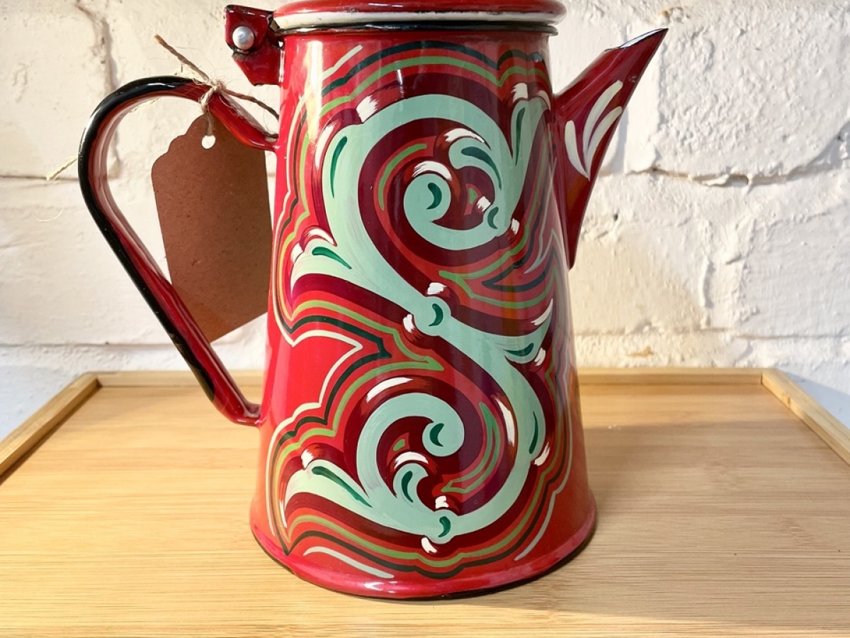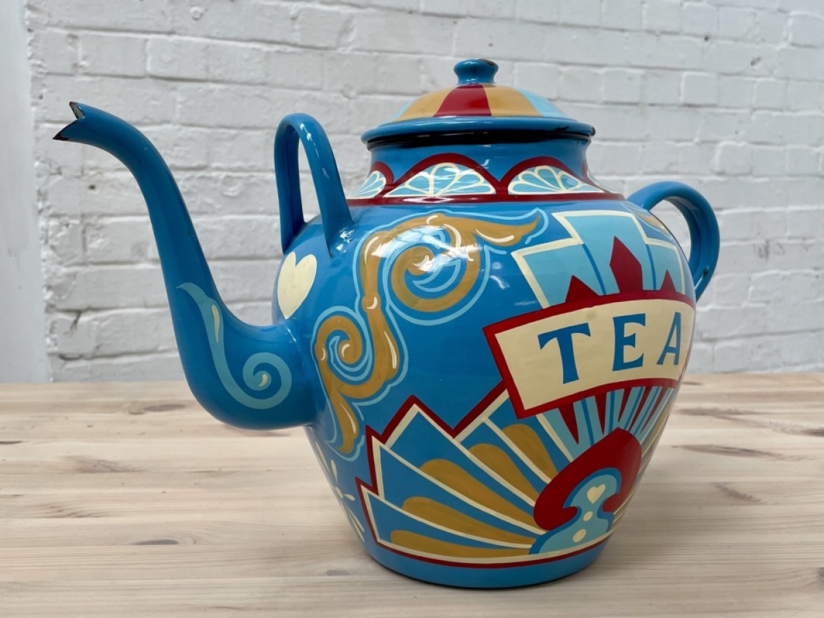 I'm a traditional signwriter and folk artist, specialising in hand-painted vintage enamelware and signs of all kinds. With one foot in the signwriting trade and another in the world of craft, I love to bring these elements together in my work. Using traditional techniques, I decorate the vintage enamelware with designs inspired by my time learning about fairground art and wagon painting, bringing these large scale and fairly niche styles to a wider audience. I bring out collections of teapots throughout the year which are for sale at markets, events and online, and am available for a wide variety of signwriting commissions all year round.