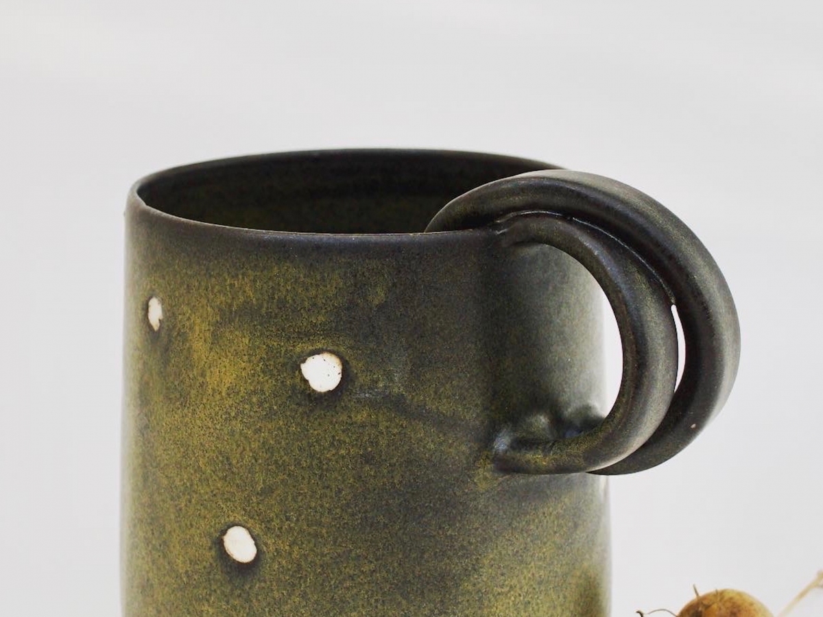 Through innovative processes and critical review she’s developed handles that are threaded through the body of the vessel. Her collections include double handles and an ‘over-the-rim,’ circular one she has registered that is separately thrown and unexpectedly attached both internally and externally.