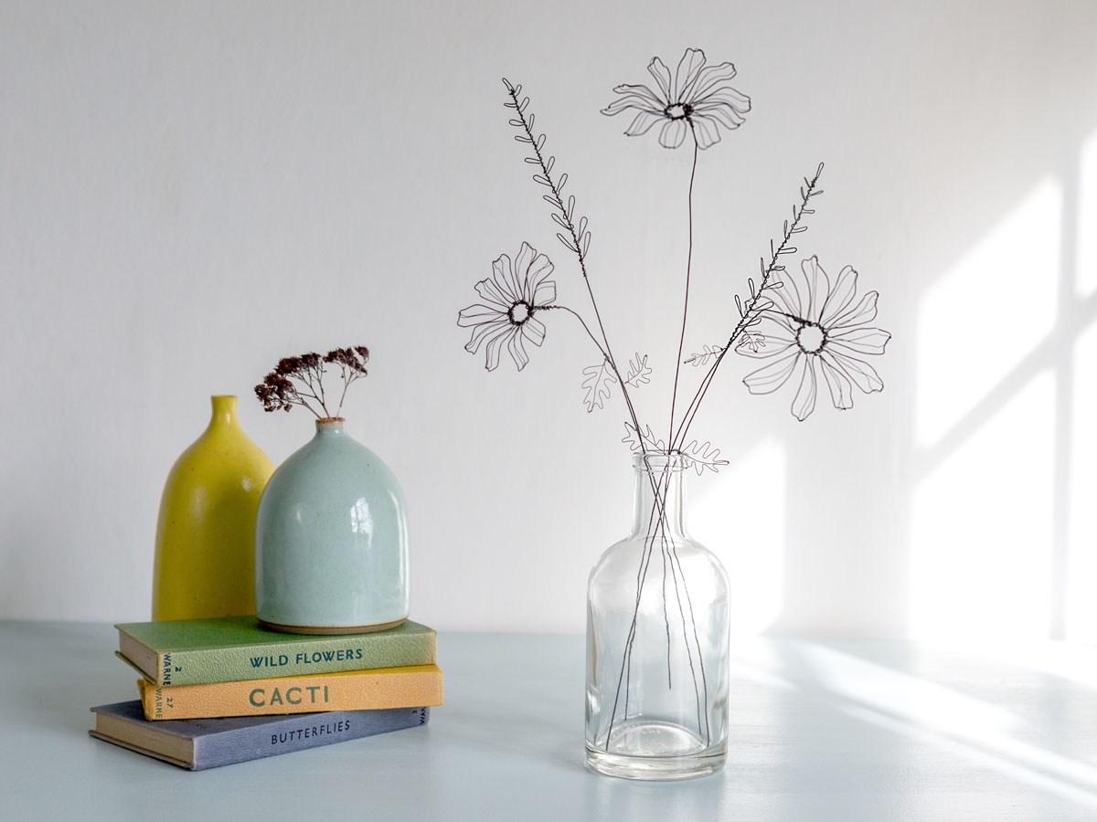 I use silver wire to create my jewellery, using wrapping, twisting and stitching techniques developed from my degree in Embroidery to create my intricate, elegant jewellery. I use glass beads for colour and texture in my designs. I am inspired by historical dress, embroidered texture and more recently nature. Many of my designs have a nostalgic feel yet are appealing to contemporary tastes. I also make a selection of wire flowers inspired by wildflowers observed from many walks around the Staffordshire moorlands.
