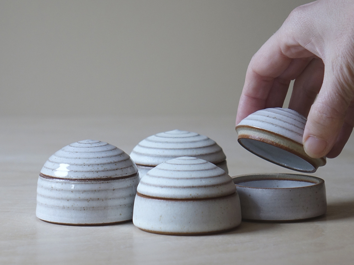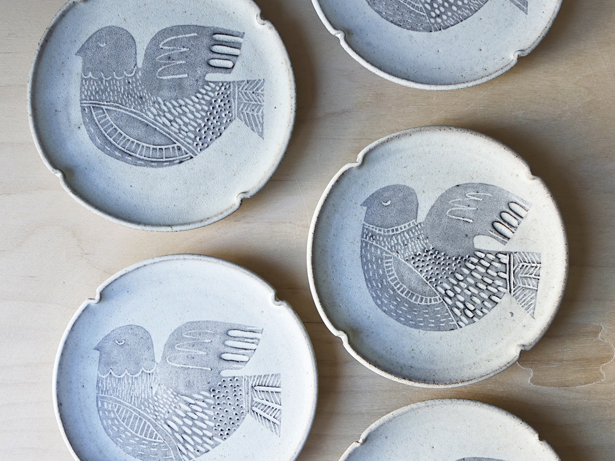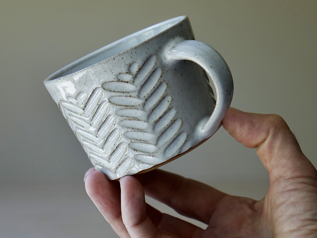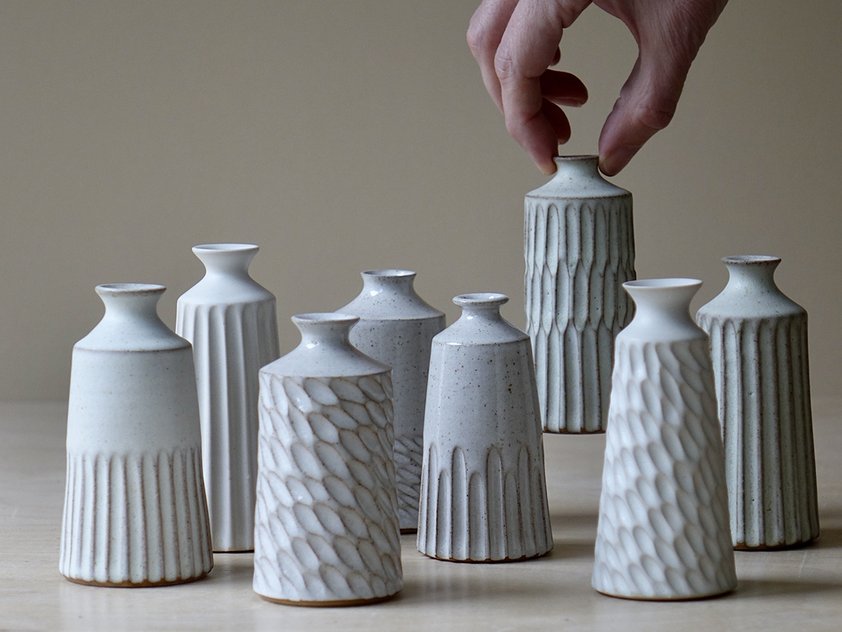 I use both the wheel and hand building techniques to make small collections and one-off creations in stoneware. I focus on hand carving techniques and mark making inspired by what I see around me and I enjoy the combination of the carving with the calming neutral colour palette.