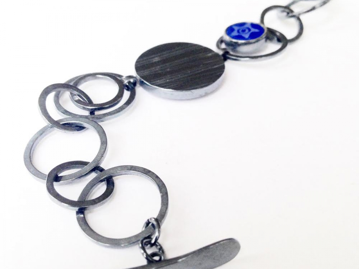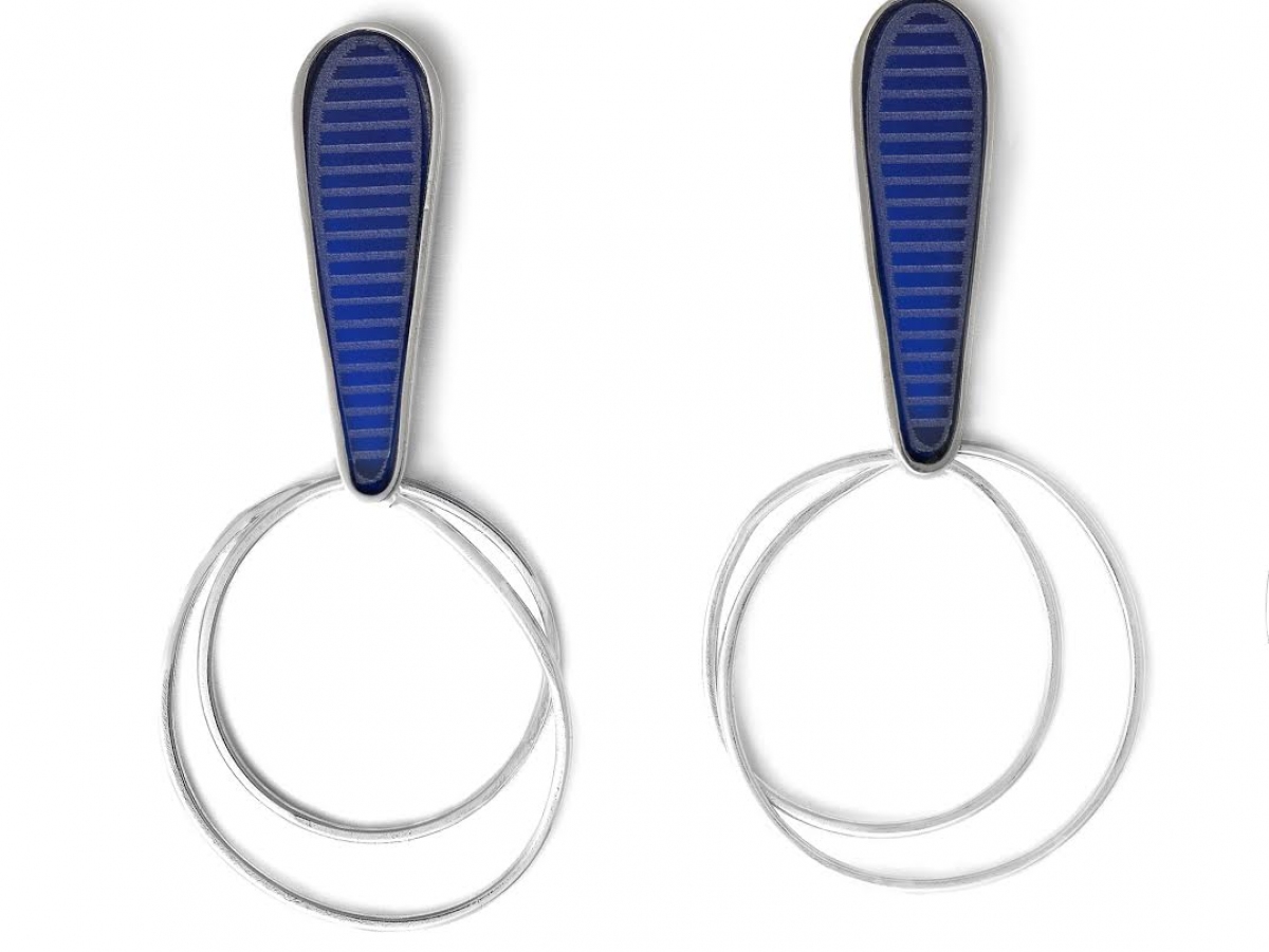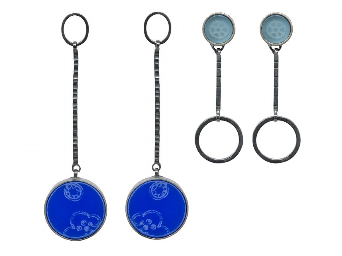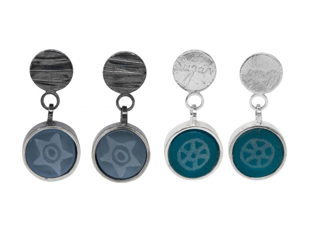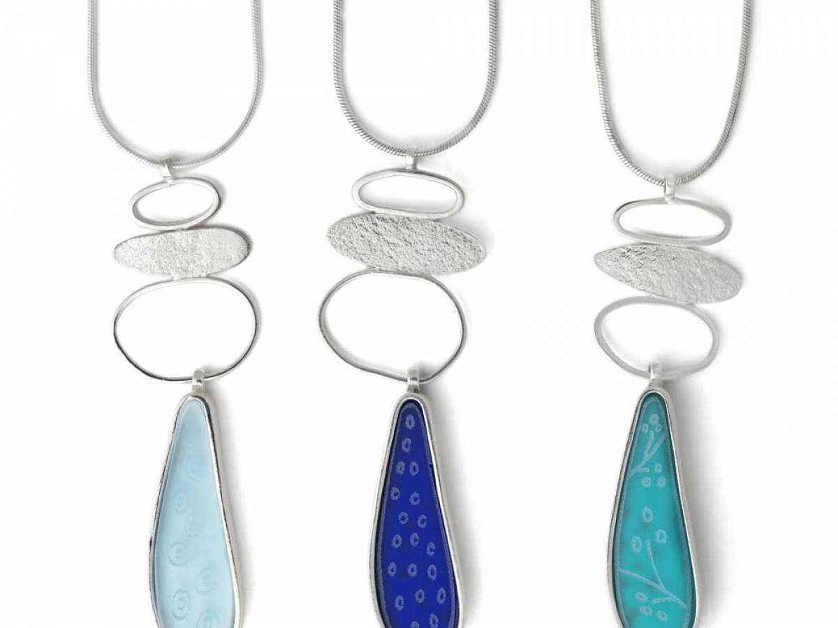 Her collections combine found beach ceramics, engraved acrylic and textured or etched recycled silver creating a subtle blend of colour and harmony.
