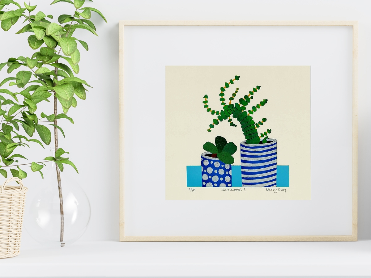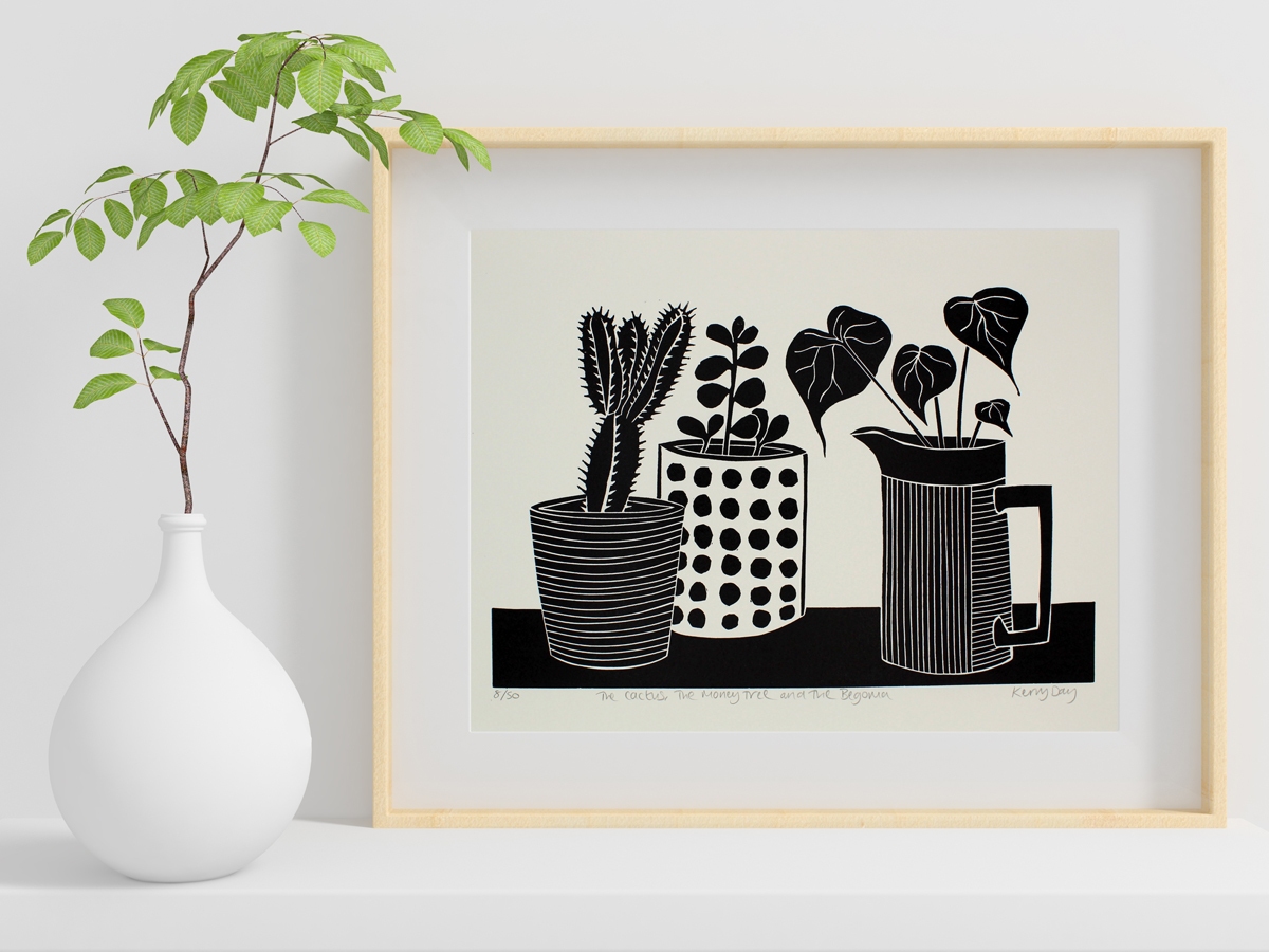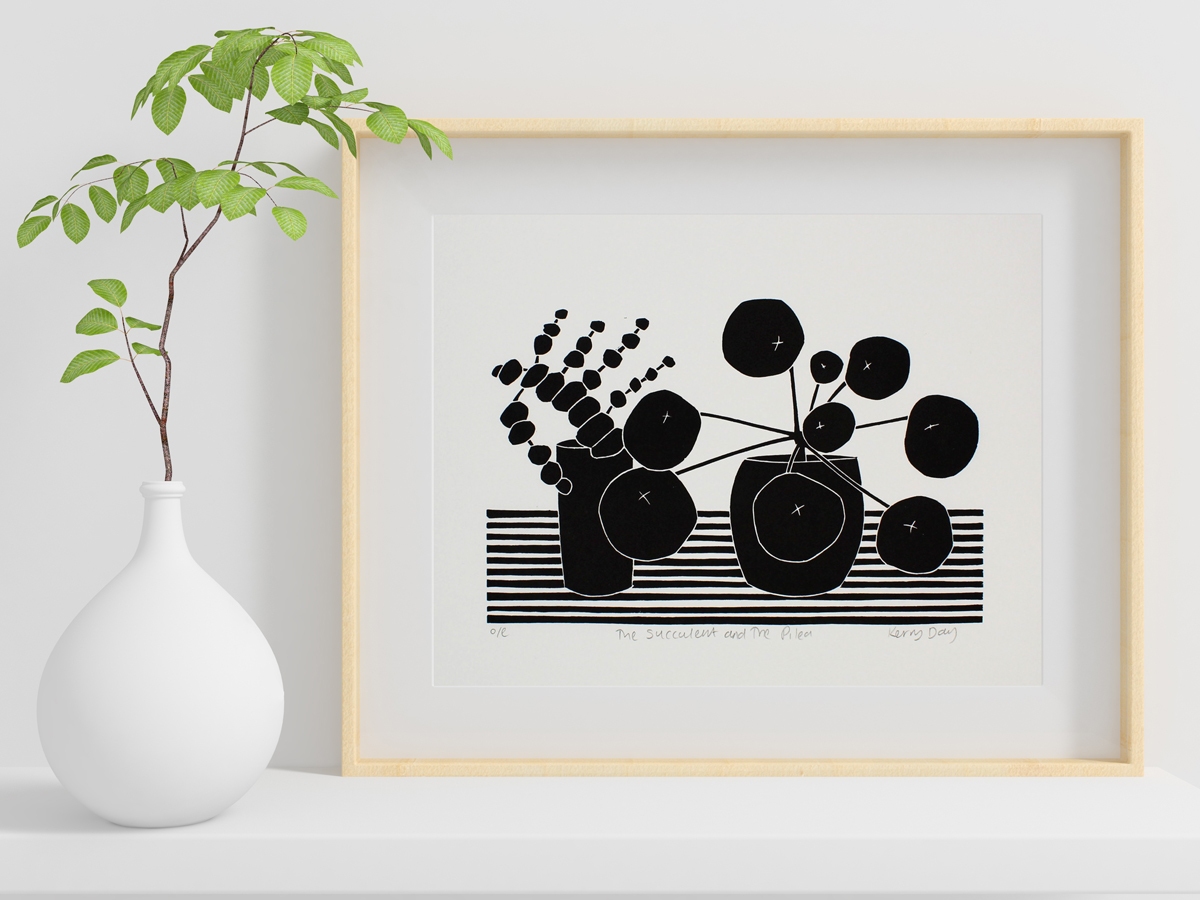 Original colourful botanical reduction linocut prints, black and white lino prints, botanical metal sculptures of cacti and succulents made from copper, brass and vintage pennies plus a great range of greeting cards, all themed around my love of my many many plants; from my architectural leafy plants to my deviously spiky cacti and my juicy looking succulents