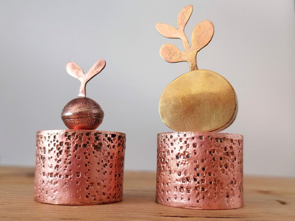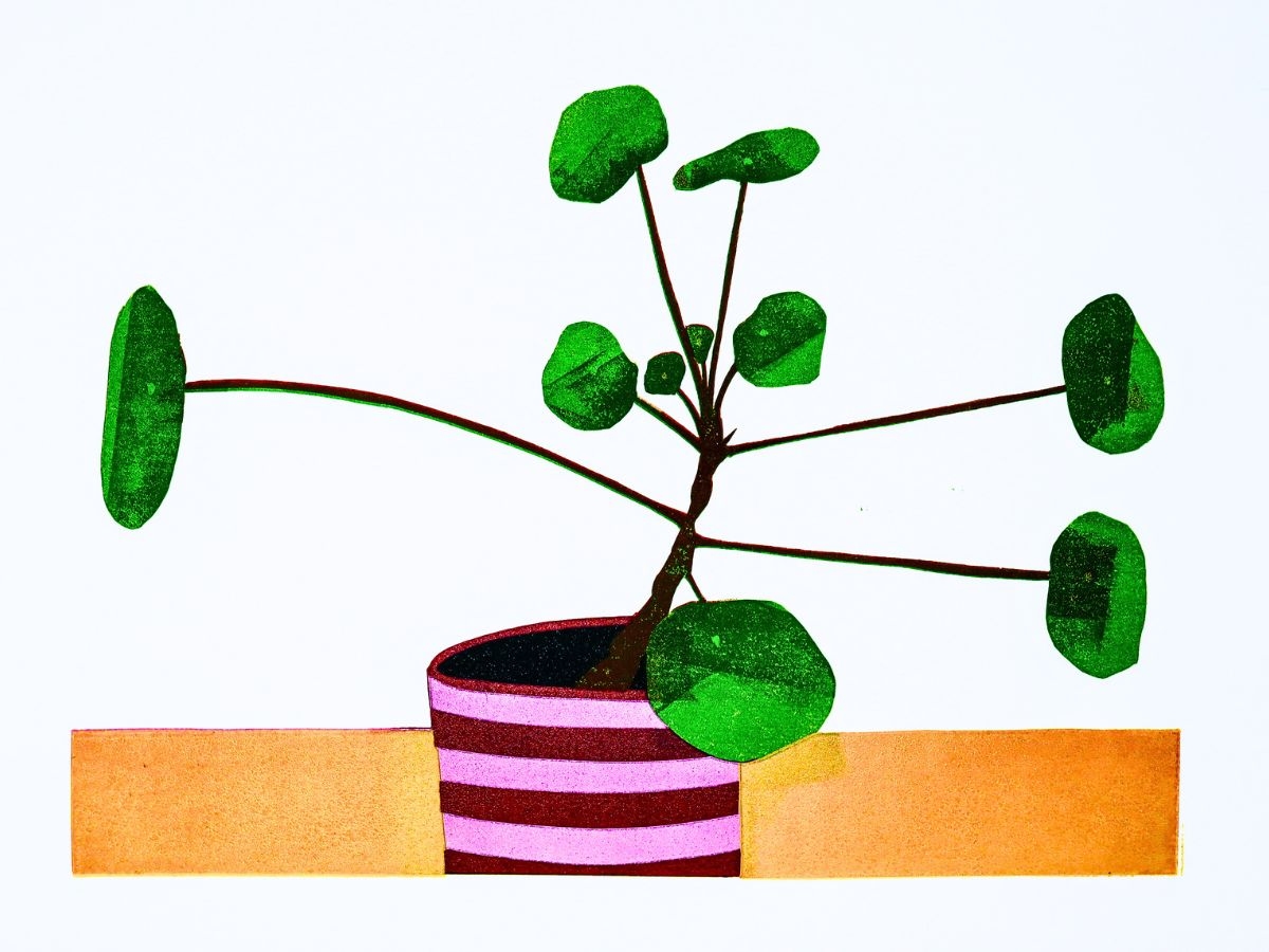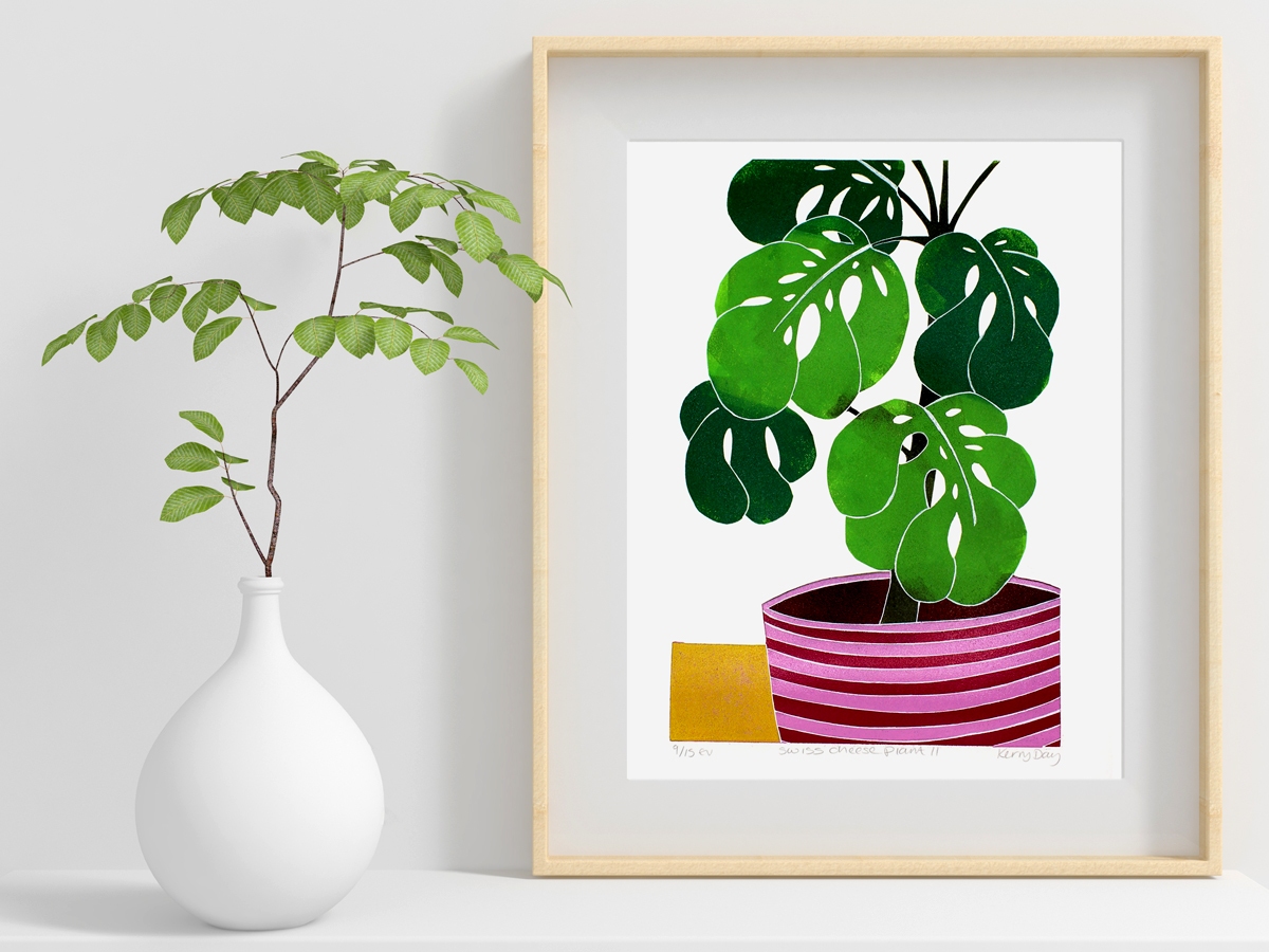 Original colourful botanical reduction linocut prints, black and white lino prints, botanical metal sculptures of cacti and succulents made from copper, brass and vintage pennies plus a great range of greeting cards, all themed around my love of my many many plants; from my architectural leafy plants to my deviously spiky cacti and my juicy looking succulents