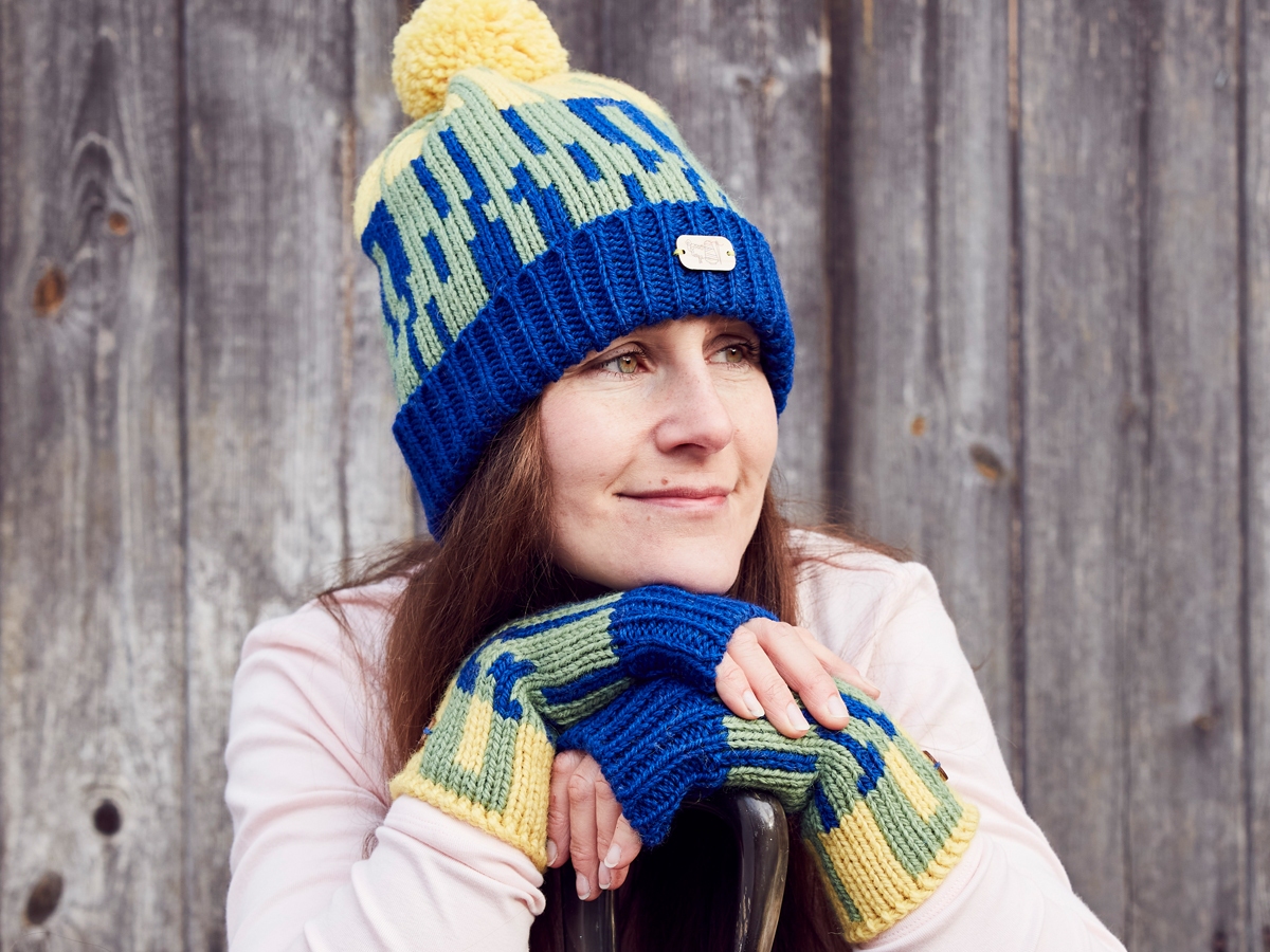 My work with the flock immerses me in the outdoors. As a designer I see the beauty in the simple and constantly take inspiration from my surroundings; a hedgerow bursting with colour and wildlife or the ageing roof rafters of an abandoned woodshed. All my knitted products are designed, handmade and finished by my own hands. They are distinctive and authentic with bold patterns, eye-catching colour and original character. I use a manual knitting machine, no electricity is used, and employ a technique called intarsia for my larger block patterns, all of which require careful hand finishing.