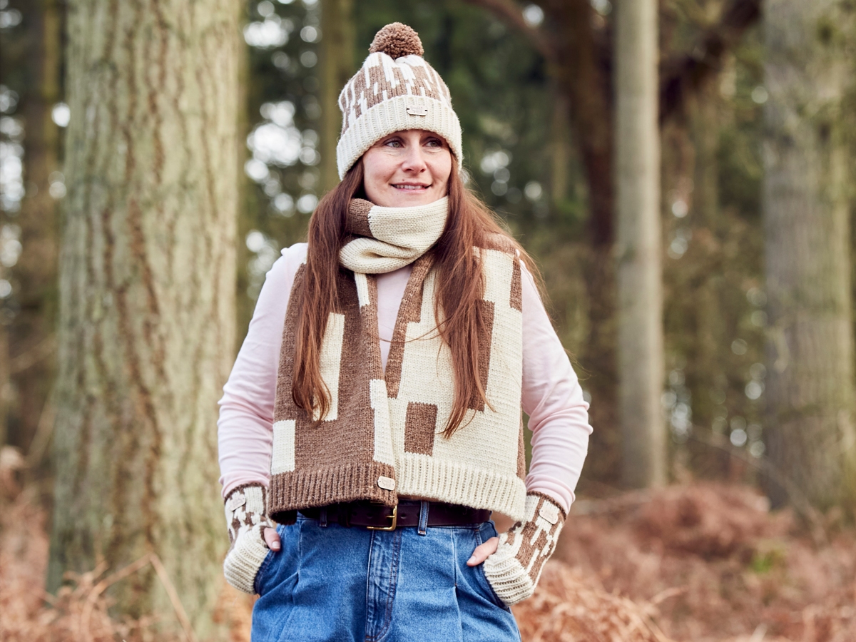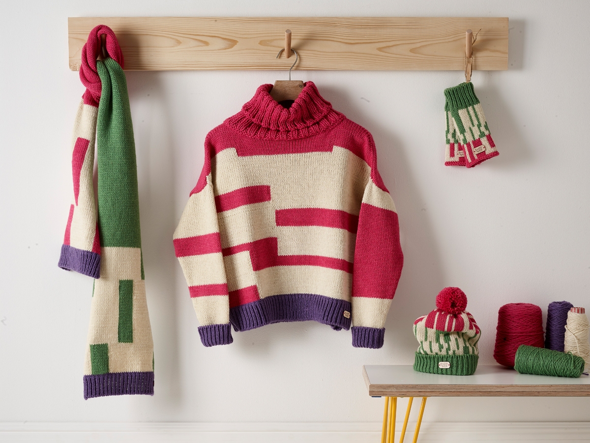 My contemporary knits are created for the sustainable wardrobe and home. Handmade in my Cotswolds studio using the wool from my flock of sheep, they are distinctive and authentic, with bold patterns and eye-catching colour. After shearing I take my wool clip to a mill in Cornwall where it is spun into yarn. It is either dyed organically to ensure excellent environmental credentials, or left undyed to showcase the natural ecru and mocha my sheep’s fleeces produce. All my knits are designed, handmade and finished by my own hands. I use a manual knitting machine and for my larger block patterns utilise a technique called intarsia. My collection includes garments, fashion accessories and homewares.