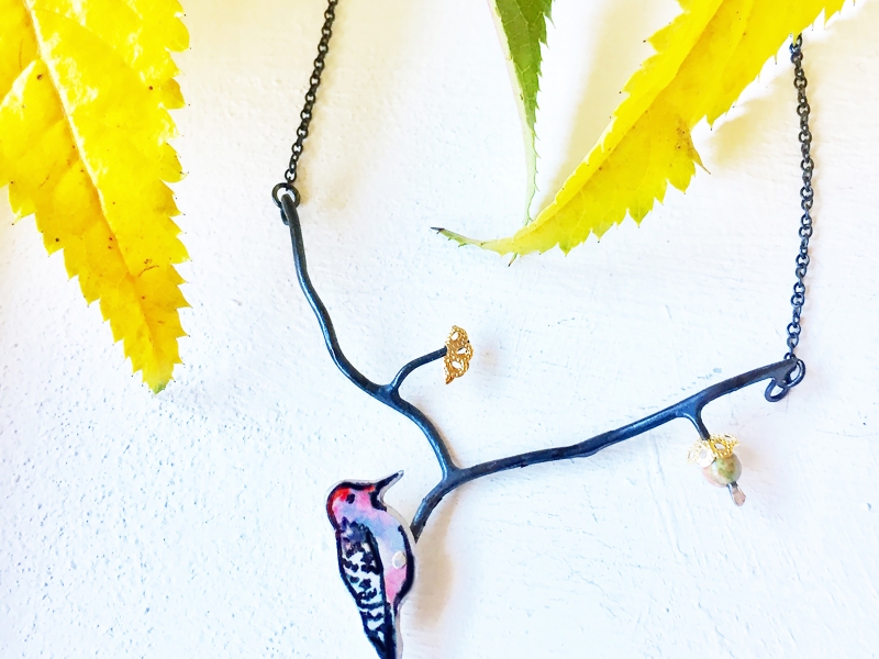 Love the delicate birds and flowers that make up her delicious pieces of jewellery, and the decorative pinks, yellows and blues outlined in bold black that colour them.