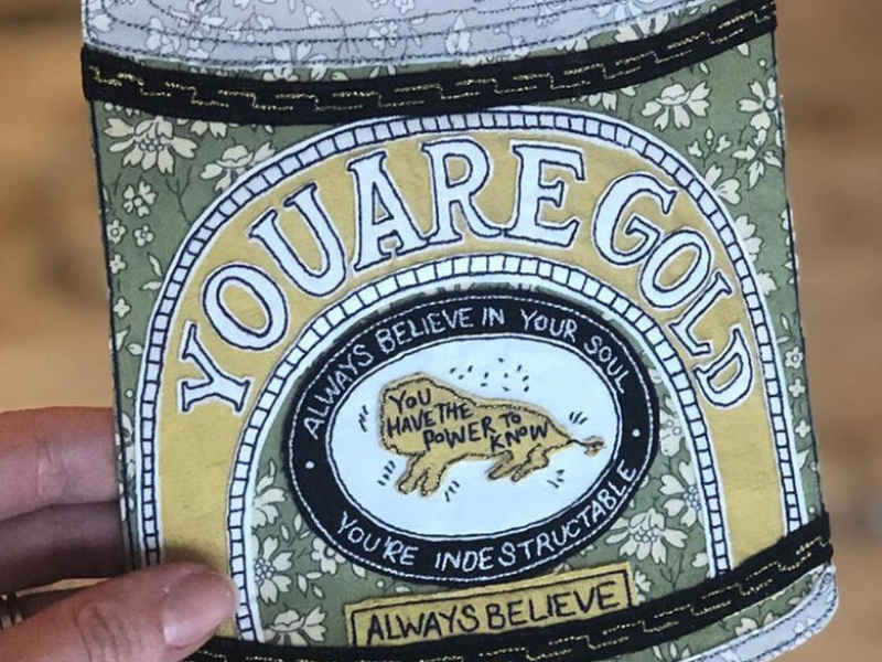 We really like the playful take on food labelling, and the way the embroidery/stitching acts as a form of drawing.