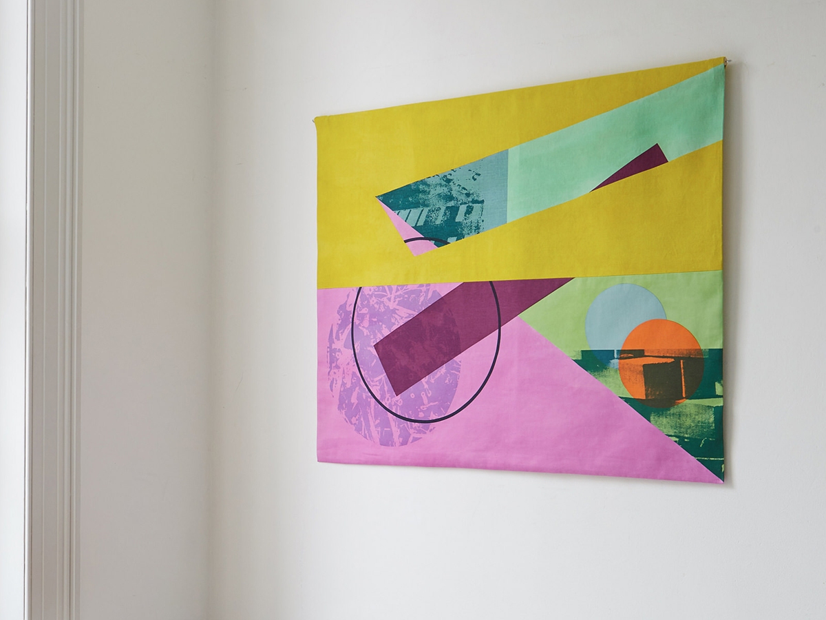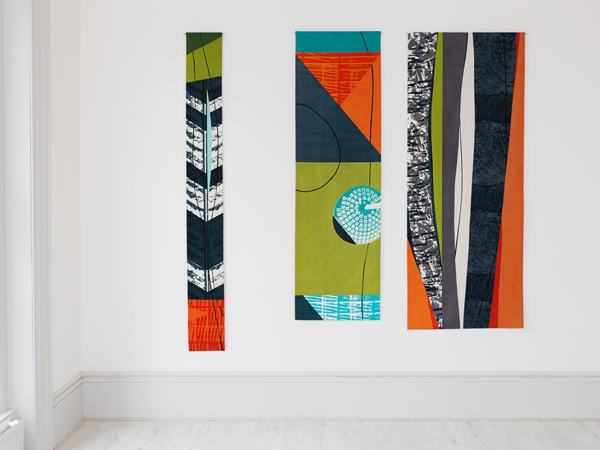 She has been working with textiles and print for over twenty years creating colourful, abstract hand-printed textile artworks for exhibitions and commissions.