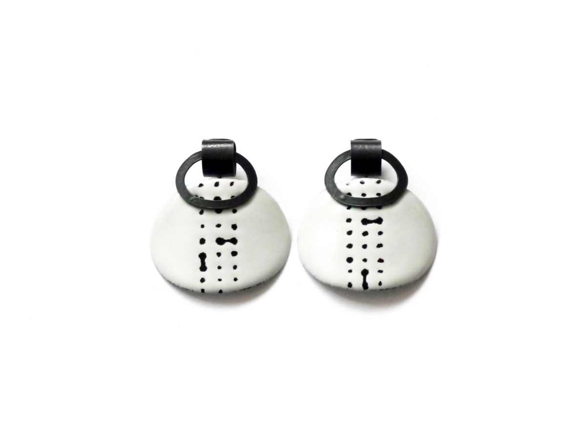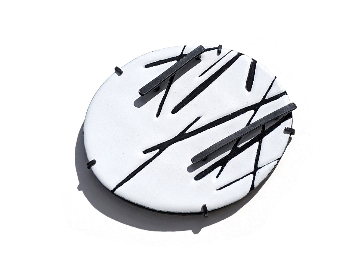 Oxidised black silver fastenings for each enamelled element are carefully designed and handmade by Mizuki, the black lines cast like shadows parallel with the scratched enamel marks.