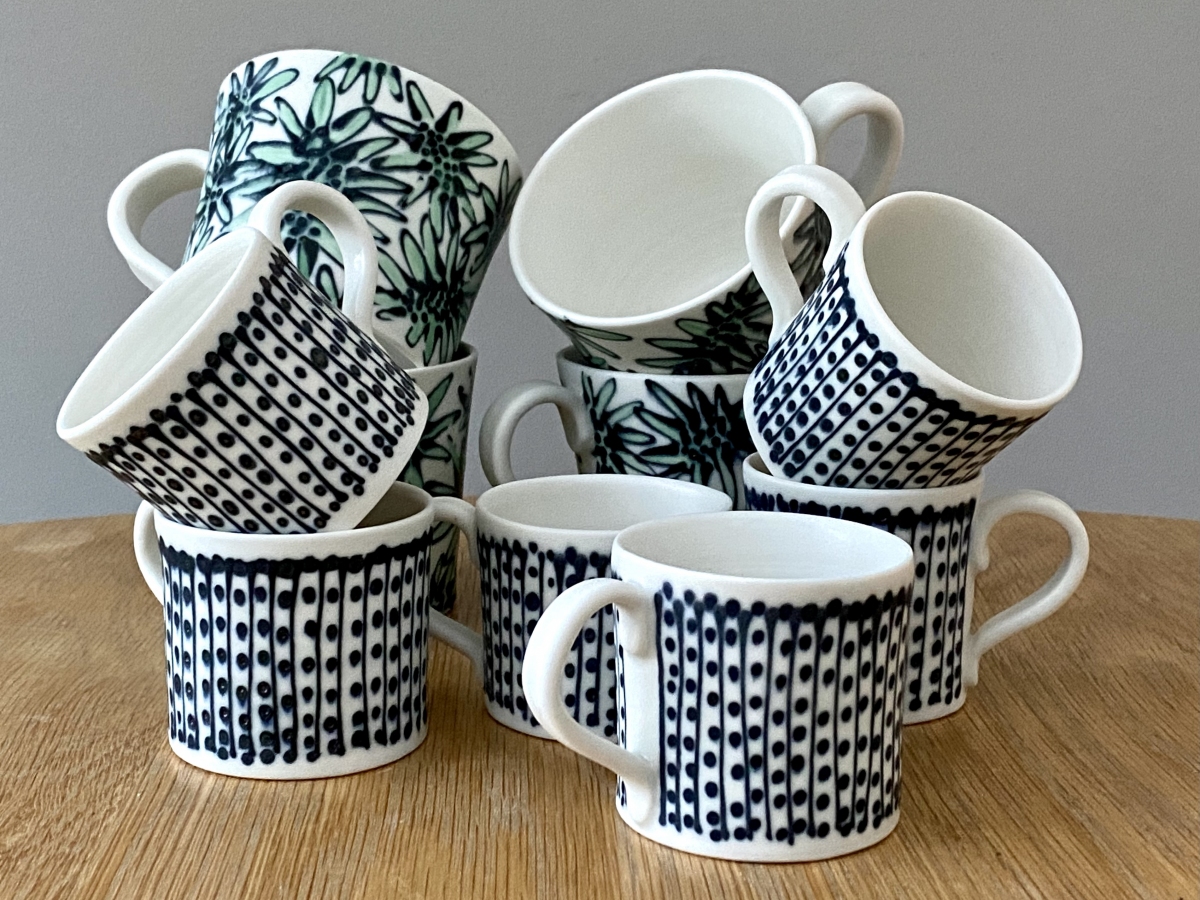 Porcelain is a fine, very strong clay. It is often seen as fragile as it can be made very thin, so thin it can be translucent, but it is the strongest clay of all as it is fired to the highest temperature. The high firing temperature fuses the clay body with the glaze creating a material that will last for centuries. All bowls, dishes, cups etc are dishwasher safe.