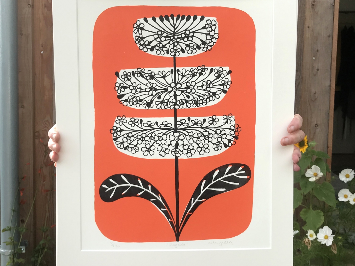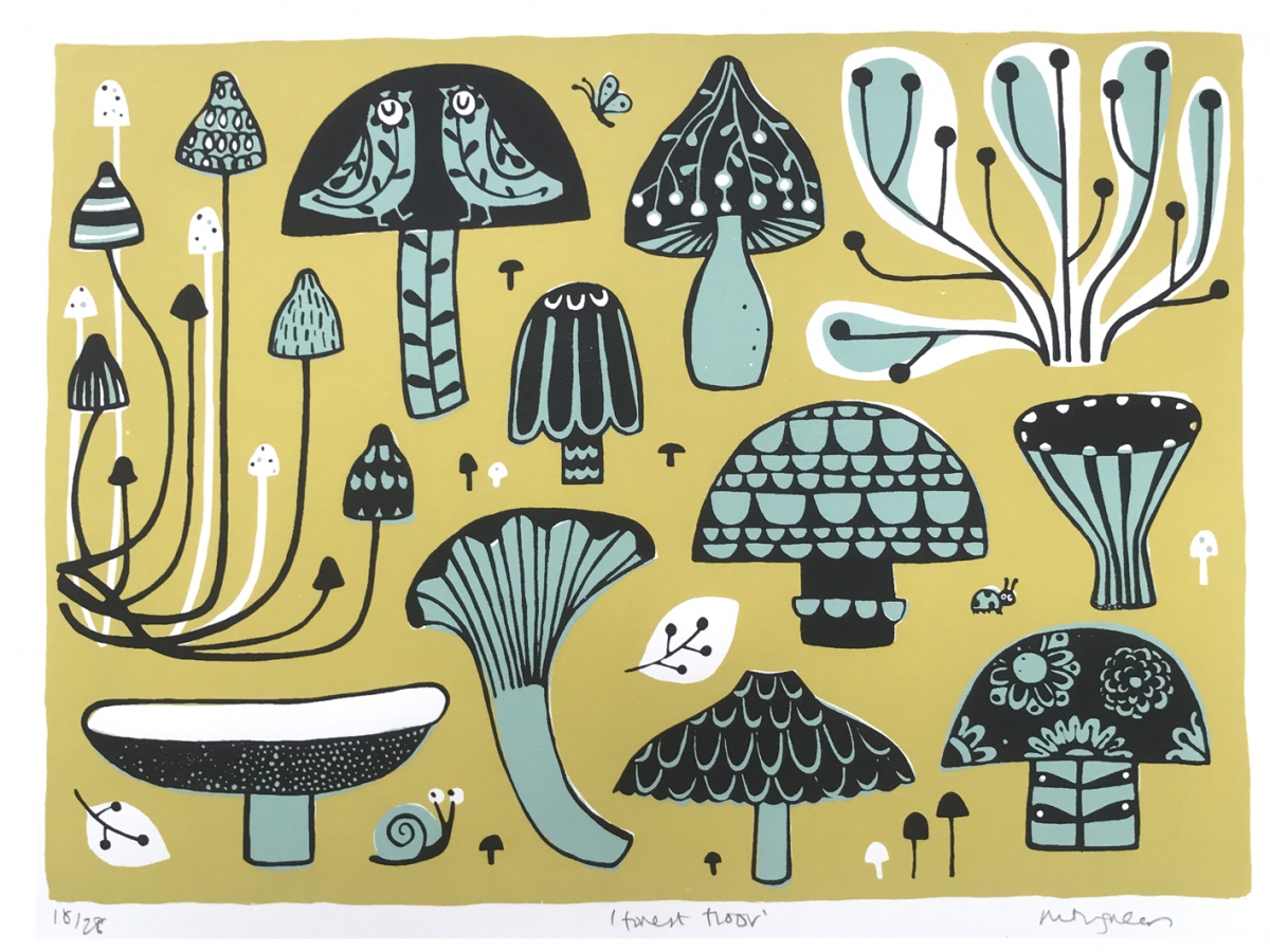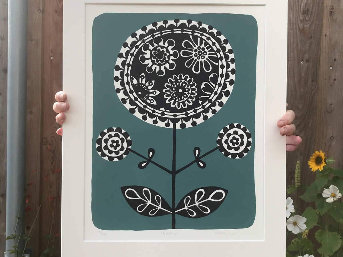 The print folio is is accompanied by a range of greetings cards, hand printed brooches and coasters, and other gift items.