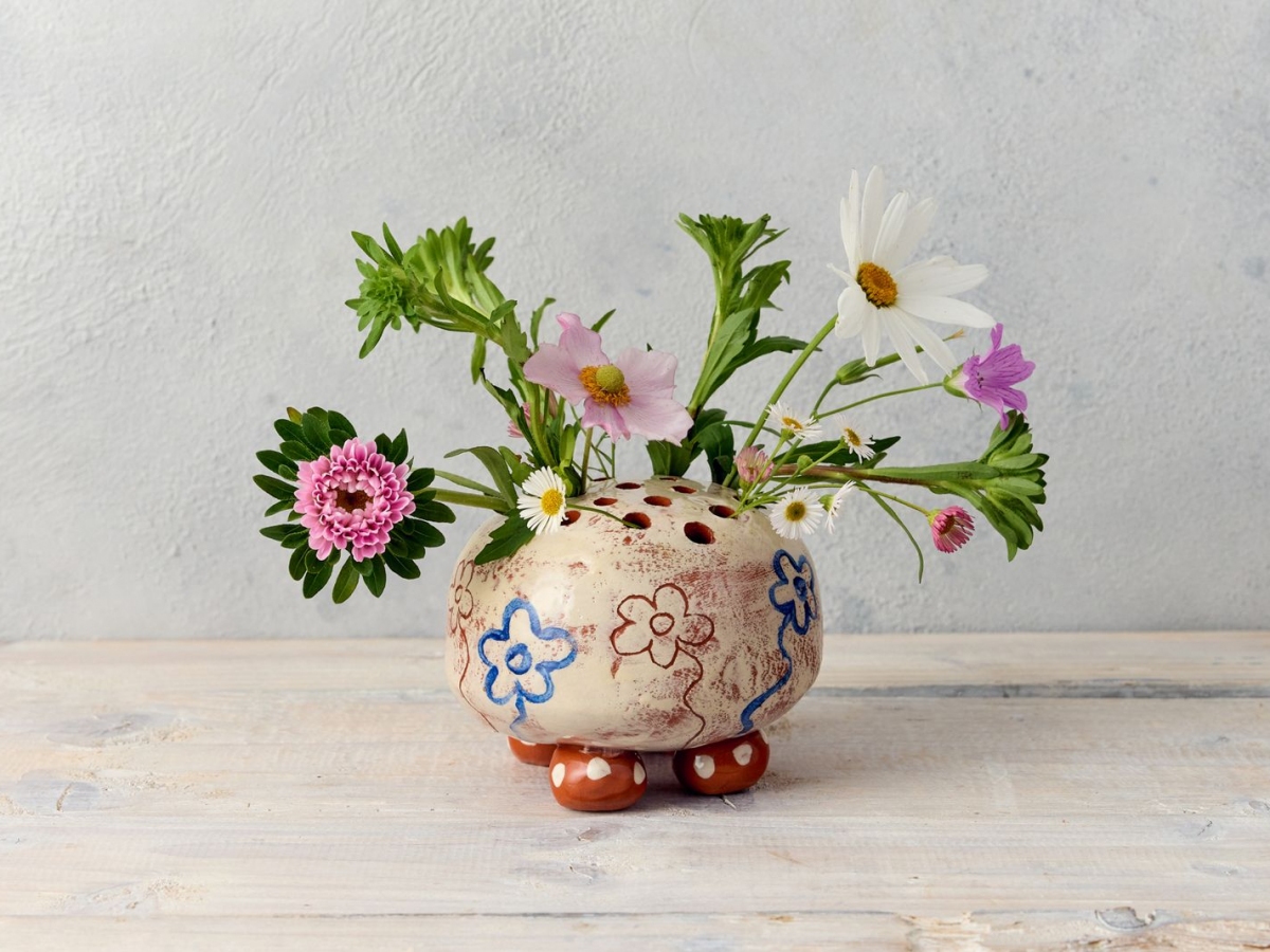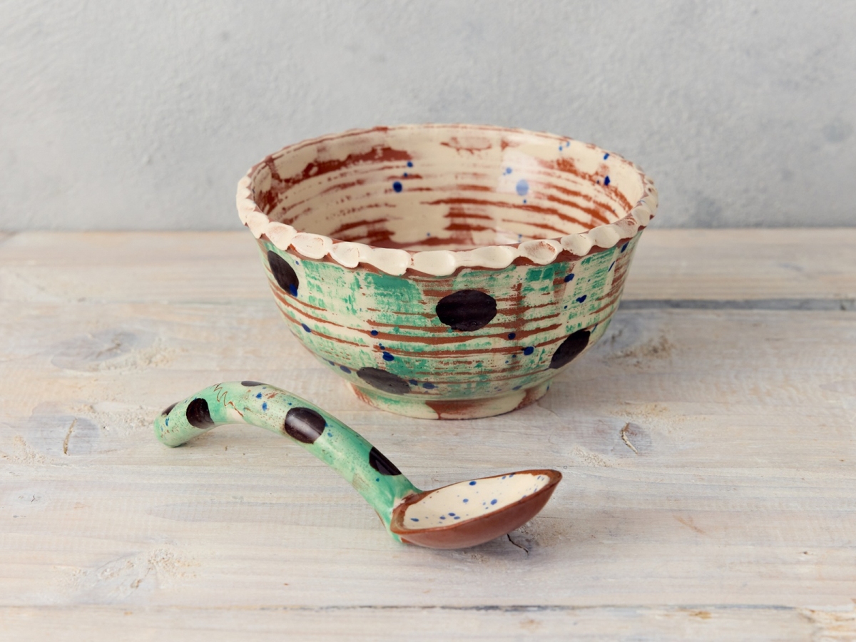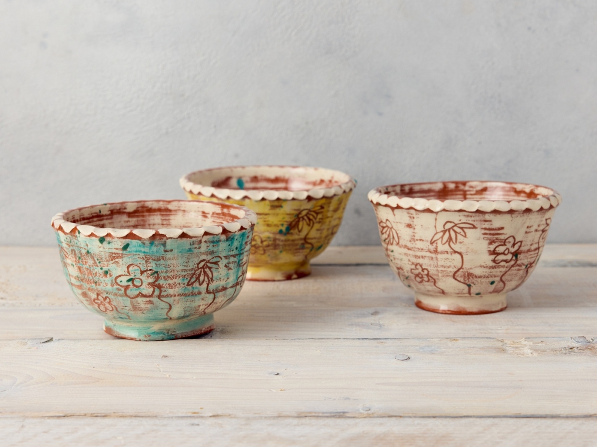 Cups and bowls are wheel thrown and I slab build flower bricks. Colourful slips are brushed and splattered. Sgraffito designs are freely etched into the clay, making the pieces pleasingly tactile. All creating happens at the wet clay stage and I finish every piece with a simple lead-free glaze.