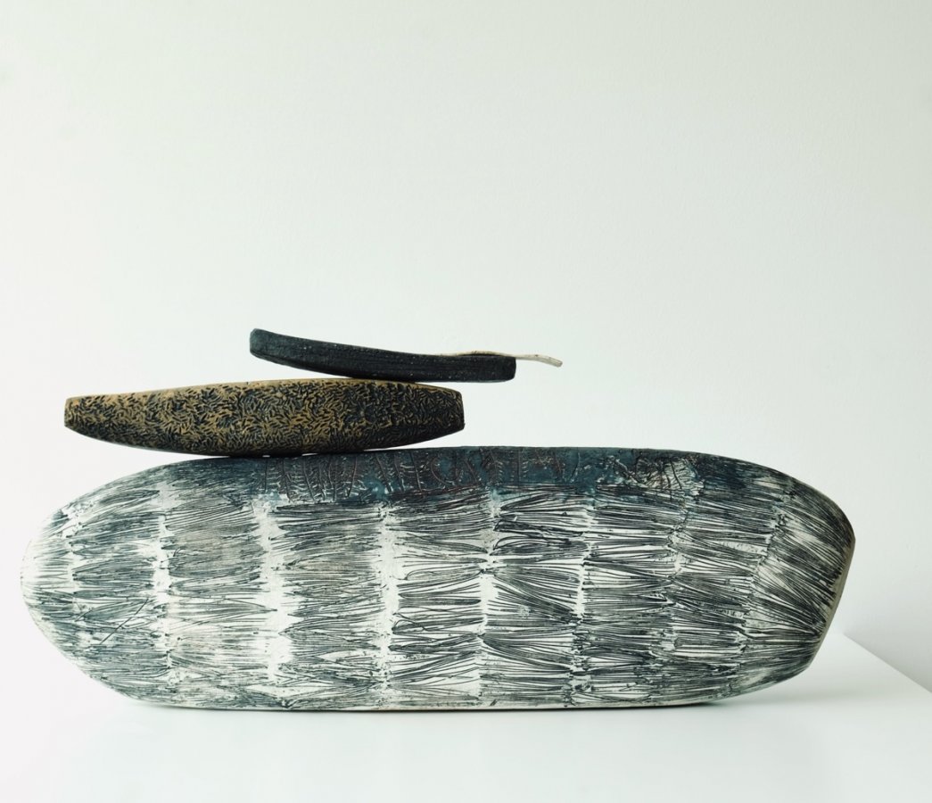 Shirley Vauvelle is an artist working from her studio near the coast in North Yorkshire. She creates assemblage sculptures hand-built in stoneware and porcelain. Her work is inspired by the balance, rhythm, and power of nature, and her emotional response to it. Much of her inspiration comes from her immediate surroundings — her studio is encircled by a mature garden filled with structural planting and trees, only a short distance from the sea. The relationship between her sculptural forms and the natural world is evident, with shapes echoing those found on beaches and within her garden. Drawing and painting play an important part in her practice, capturing shifting light and form which feed into her evolving sculptural language.