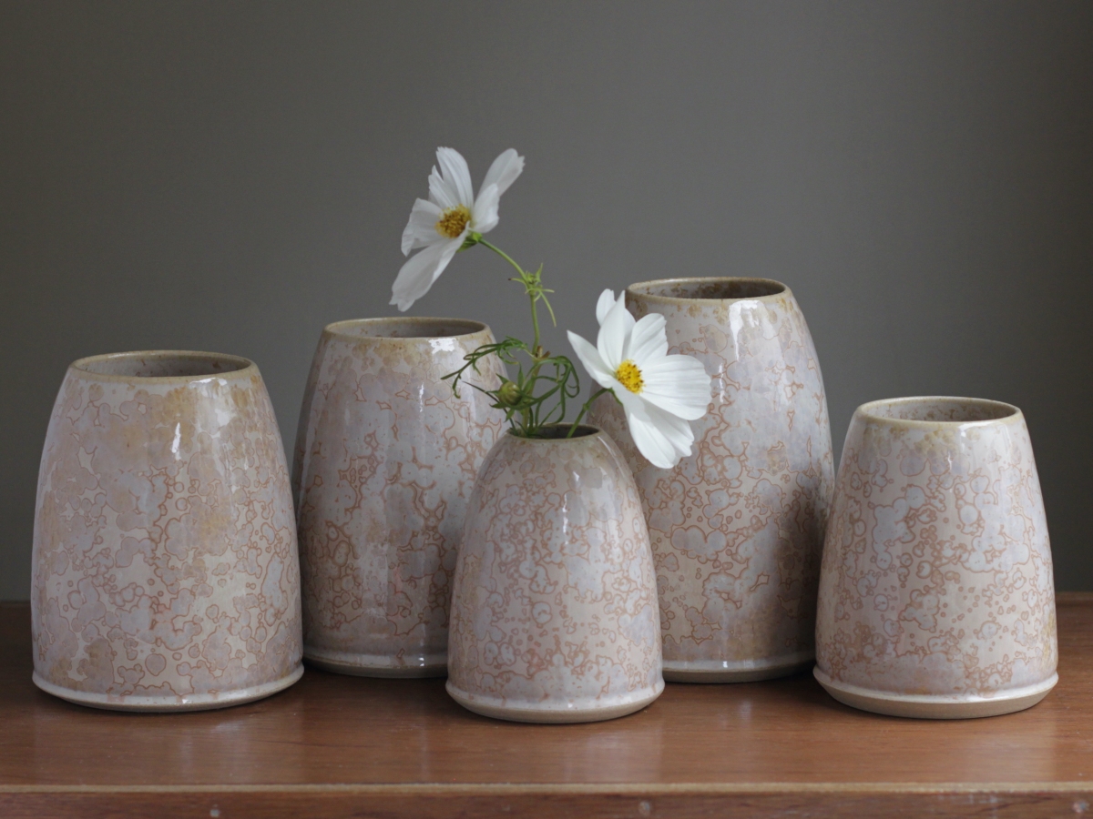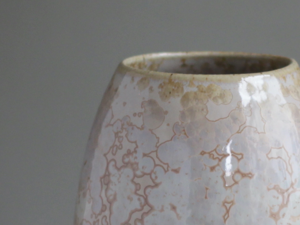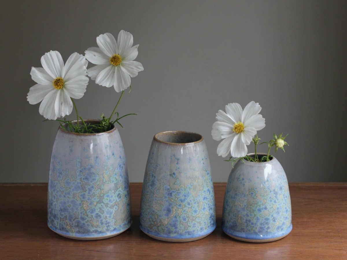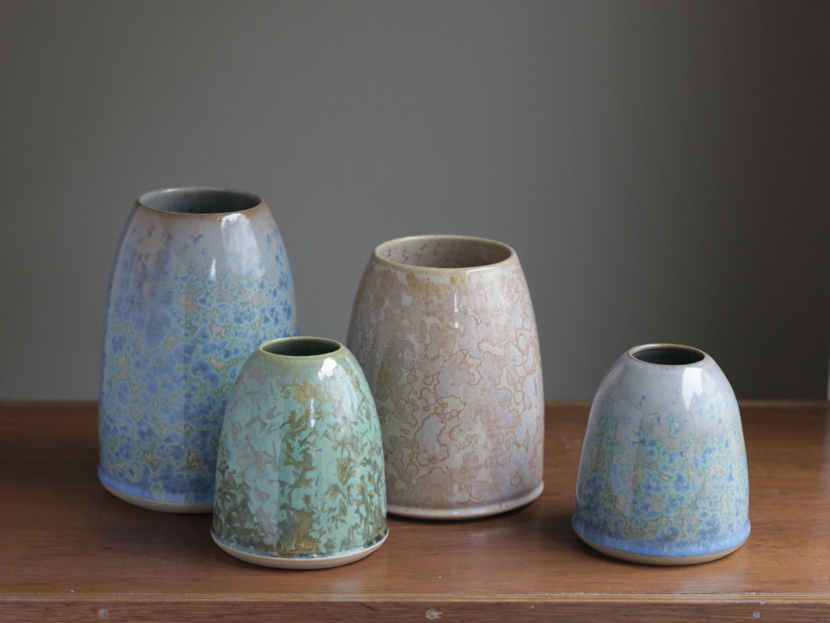 Su Thompson throws stoneware vessels paired with crystalline glazes. Using her own developed recipes, she encourages the growth of small, abundant crystals. Inspired by the coast and surrounding landscape, her practice explores the relationship between form, surface and glaze chemistry. She favours muted colours and patterns formed through fluid glazes and the handmade process.