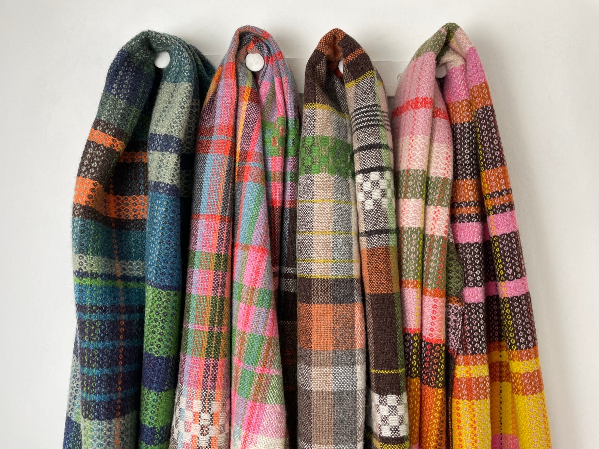 I draw inspiration from my coastal location overlooking the cliffs of North Cornwall. This rugged and beautiful landscape feeds into my daily work offering me endless ideas for an abundance of colour ways and textures which I use in my hand woven textiles. I work in my garden studio creating unique lengths of cloth from 100% lambswool which are transformed into scarves.