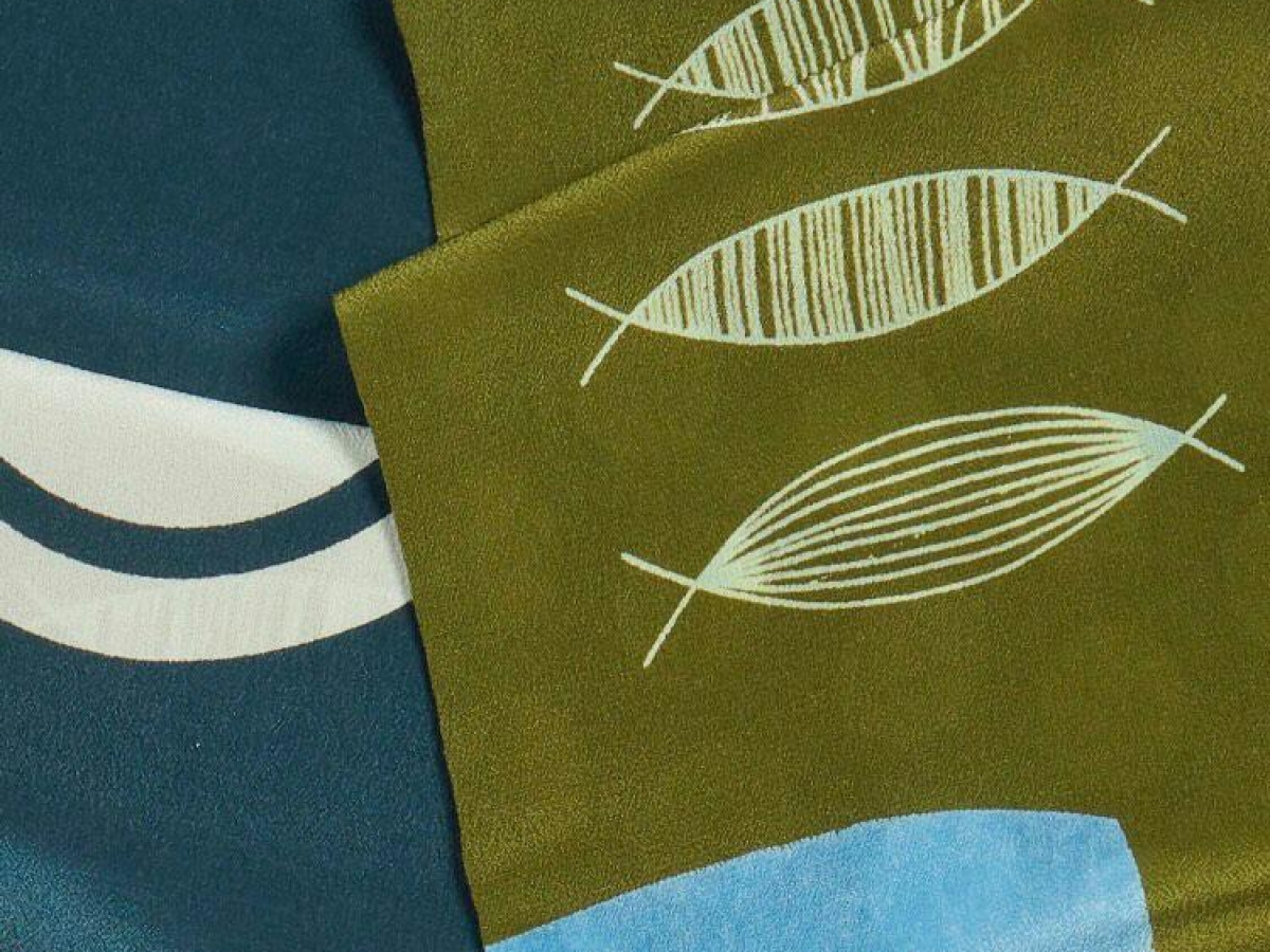 Fiona's current collection of prints are inspired by her love of mid-century design. Colour is very important to her and printing using the discharge method enables rich shades to be produced.