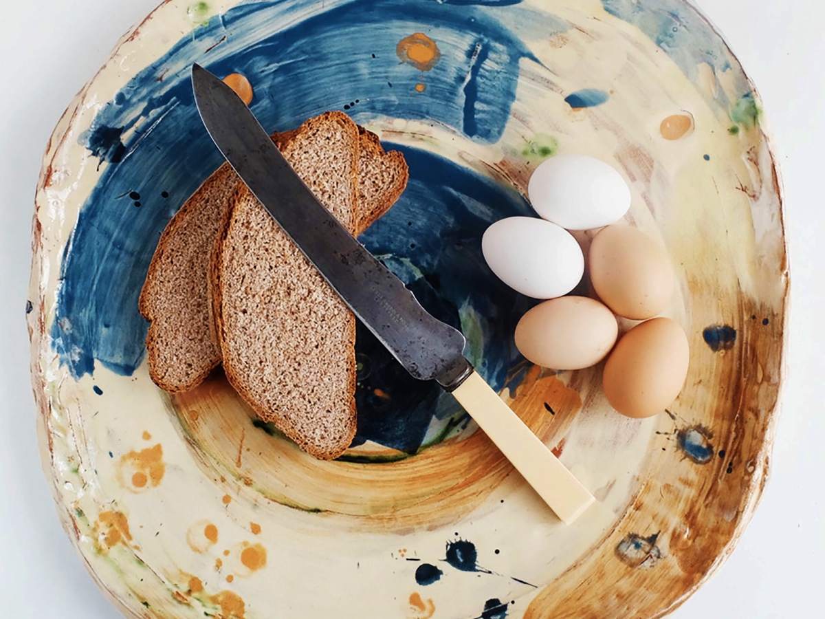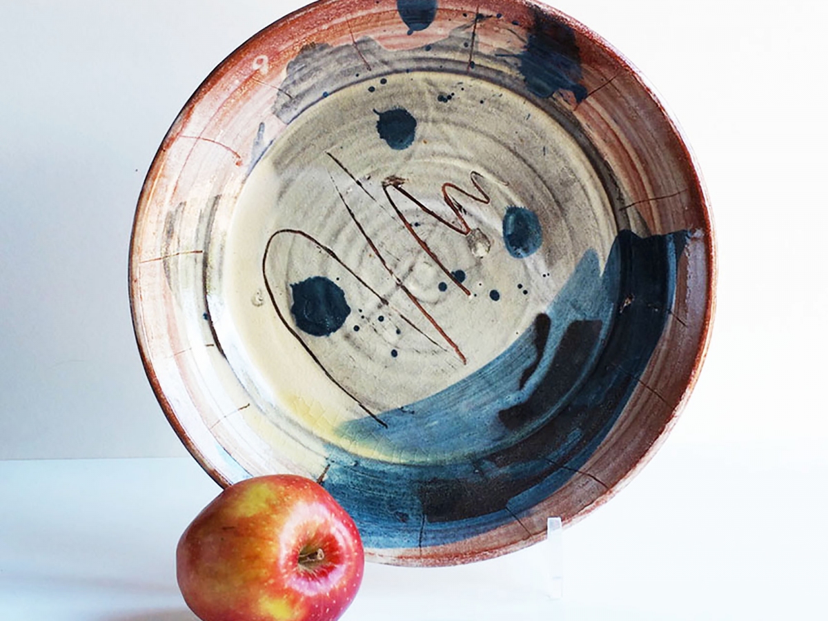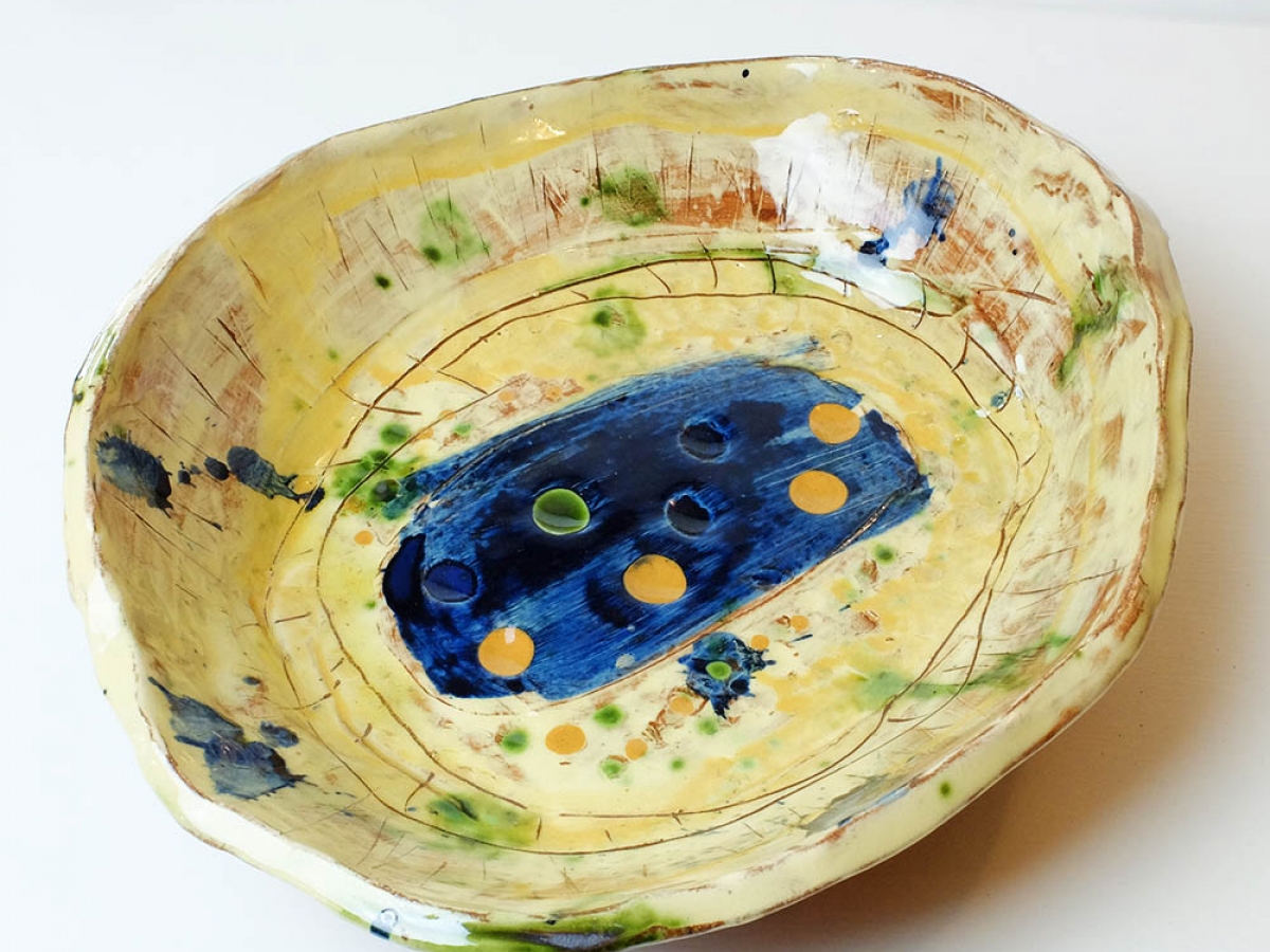 My work is slipware and sgraffito on terracotta clay, with a clear glaze. Single fired in an electric oven to 1005 degrees. Pieces are hand made or thrown on a kick wheel. Everything is decorated and glazed while the clay is still wet. Then left to dry before firing. I love to hand make my work; Large platters, some with feet some without and I love spontaneity. My work is quite individual but I feel works together well.
